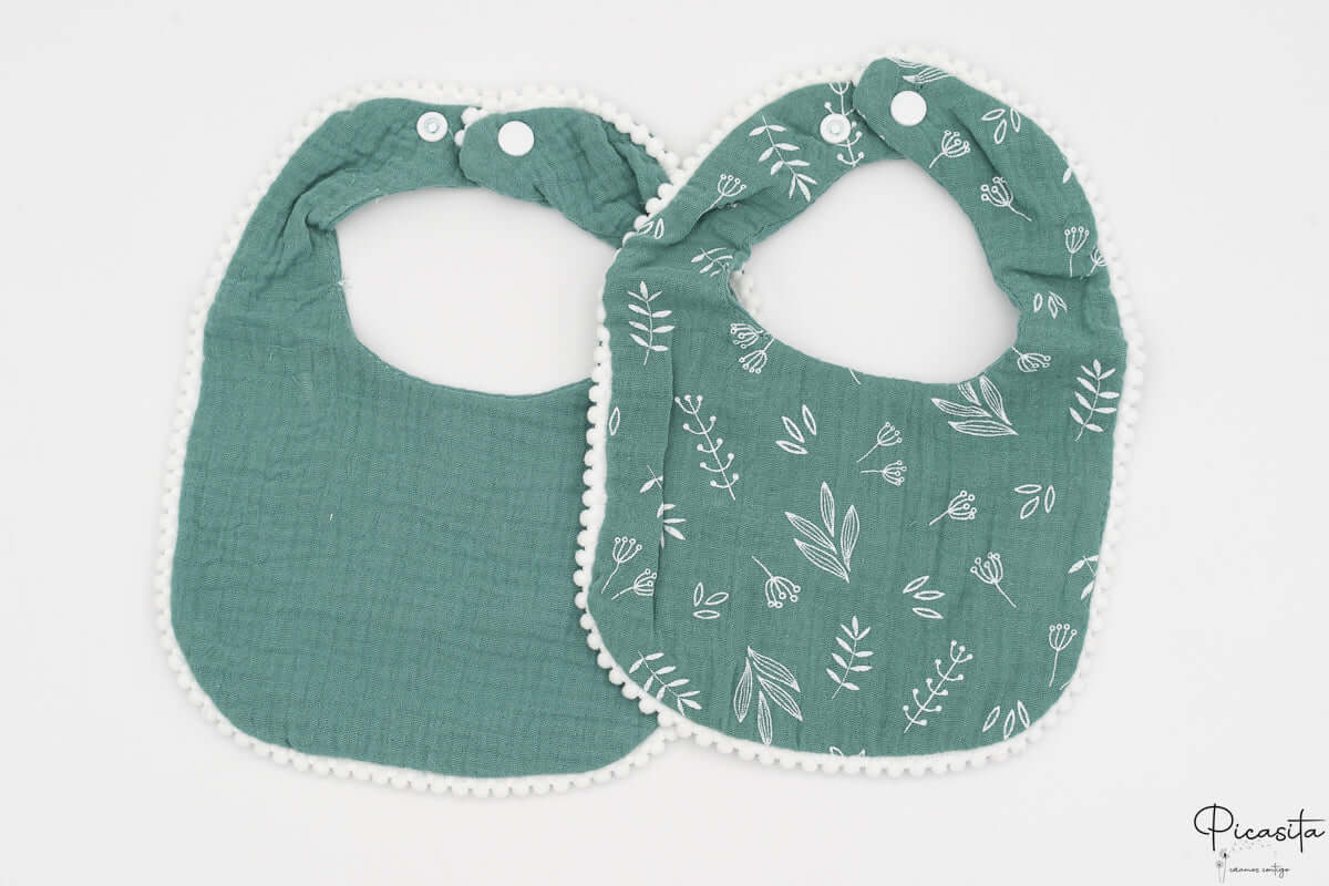 Cada pack inclui duas unidades com designs coordenados que dão um toque terno a qualquer conjunto. Encontrará uma opção em cor lisa vibrante e outra com estampados subtis, como pequenos abetos ou motivos botânicos. O detalhe distintivo destes babetes para bebé é o seu remate de pompons (madroños) brancos, que lhes confere um ar artesanal e muito doce.