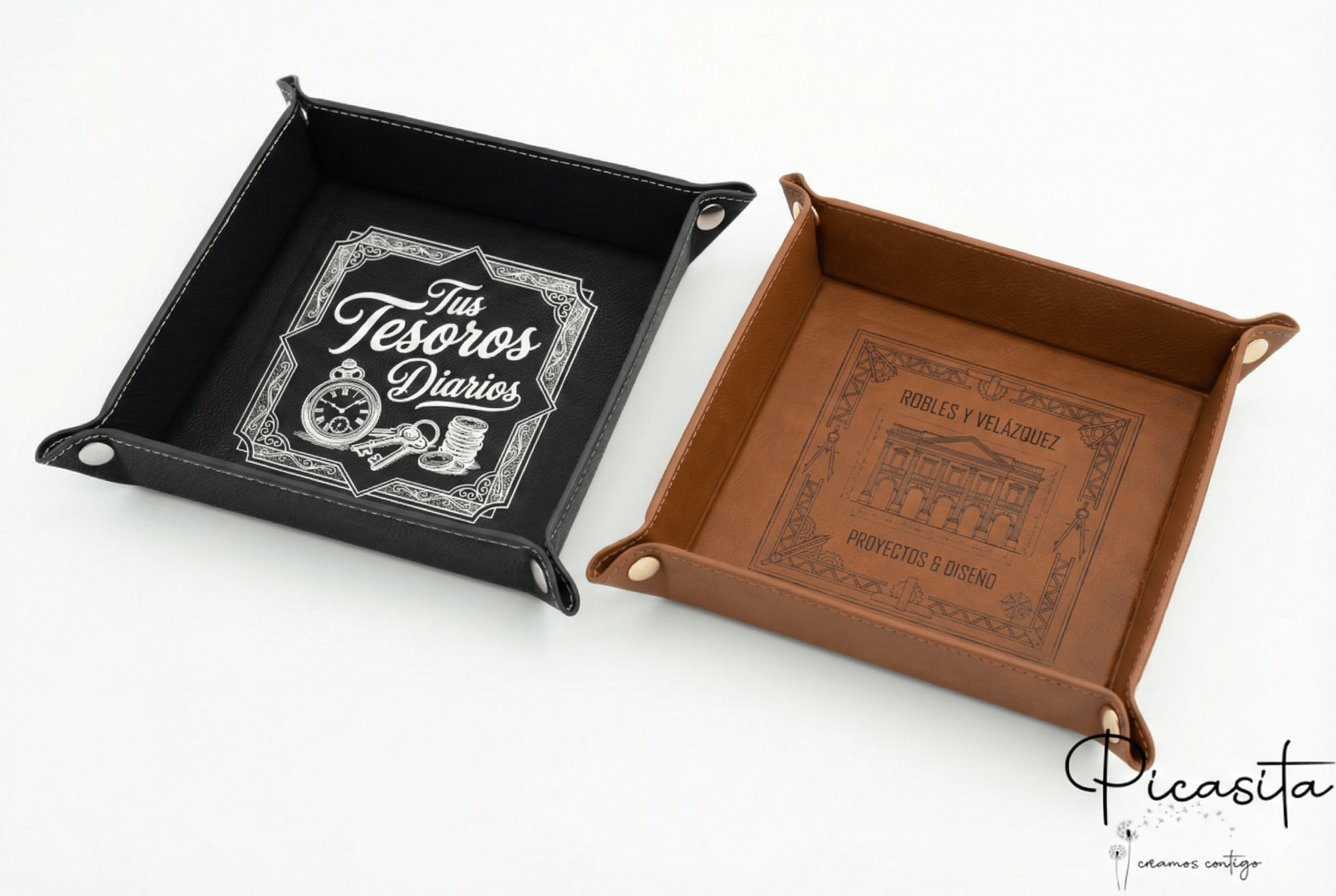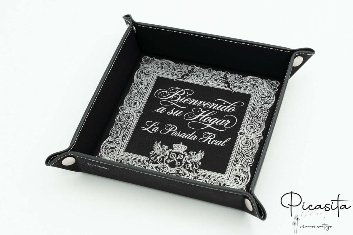 A nossa exclusiva valet tray está disponível em duas cores clássicas e altamente combináveis: um sóbrio e moderno preto com botões prateados e costuras brancas em contraste, e um quente e tradicional castanho com botões dourados e costuras a condizer. Ambos os modelos de bandeja vaciabolsillos partilham a grande vantagem de serem completamente desmontáveis. Quando não precisar de usar a sua bandeja de cortesia, pode desabotoar os fechos facilmente e guardá-la totalmente plana, otimizando ao máximo o espaço em gavetas ou malas. É, sem dúvida, o equilíbrio perfeito entre funcionalidade absoluta, design premium e praticidade diária.