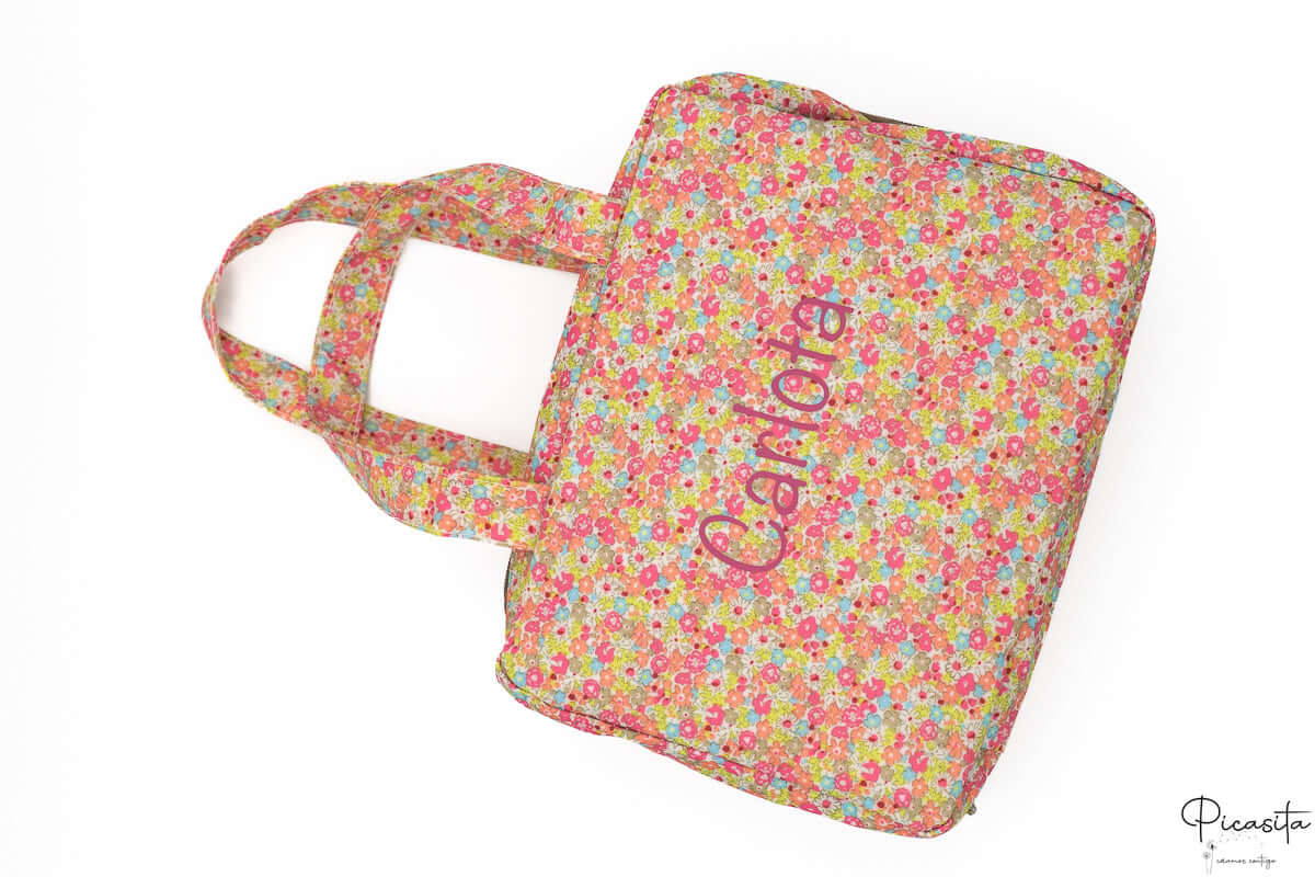 Fabricada com materiais resistentes e leves, esta bolsa de muda para creche inclui alças confortáveis para que seja muito fácil transportá-la pendurada no carrinho ou na mão. Está disponível em três belos designs: Animais, Flores Rosa e Flores Verde, adaptando-se ao estilo de cada família. Além disso, para evitar confusões ou perdas no centro, oferecemos a opção de personalizá-la com o nome da criança através de vinil termocolante de alta resistência.