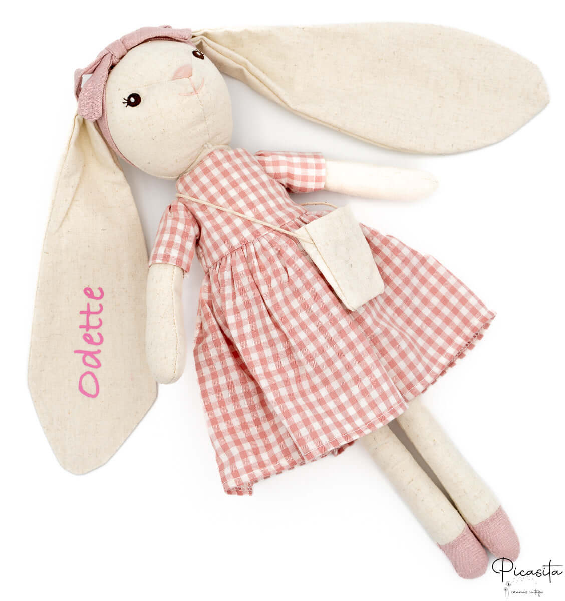 Este design exclusivo destaca-se pelo seu precioso vestido de quadrados vichy rosa e branco, complementado com uma fita de cabelo e uma pequena bolsa de tecido a condizer. Por ser uma boneca de coelhinha com traços totalmente bordados (olhos e nariz), é 100% segura para bebés, eliminando qualquer risco de peças pequenas. É o objeto de apego ideal para facilitar o sono e proporcionar segurança constante. Ao escolher esta boneca de pano, estás a optar por um produto artesanal na sua essência e moderno na sua personalização.