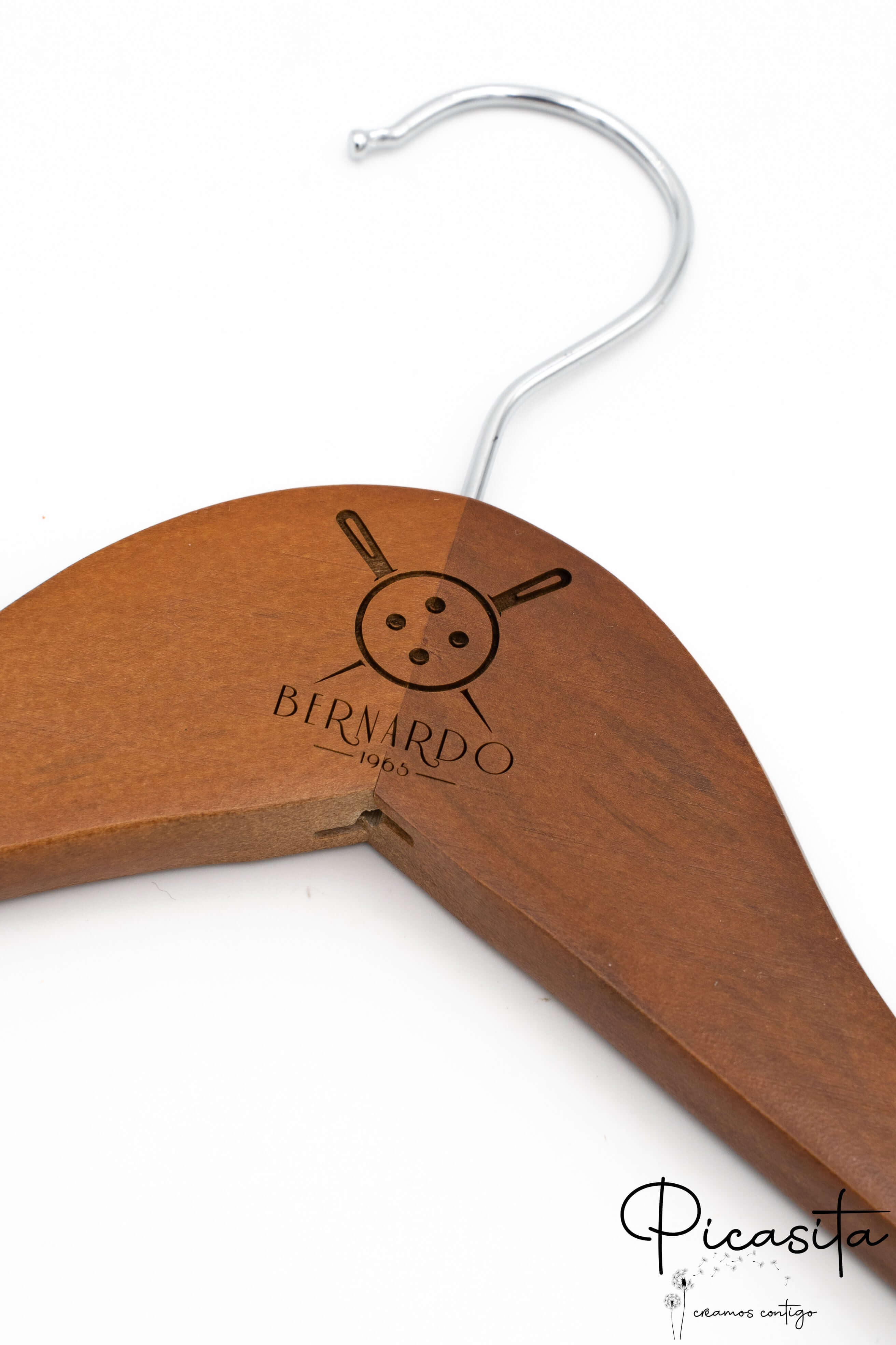 Na Picasita.es especializamo-nos em tornar cada objeto único. Estes cabides com pregadeiras são personalizados através de laser de alta precisão, conseguindo um acabamento monocromático elegante e permanente. Como se observa nas imagens de detalhe, podemos gravar logótipos corporativos, nomes ou datas especiais tanto na parte central (pescoço) como nos braços do cabide. É o detalhe perfeito para casamentos, eventos ou para reforçar a imagem de marca do seu negócio de moda.