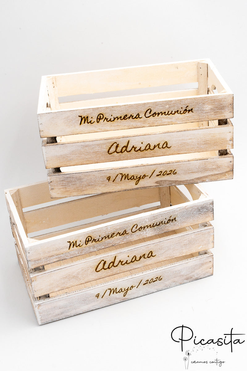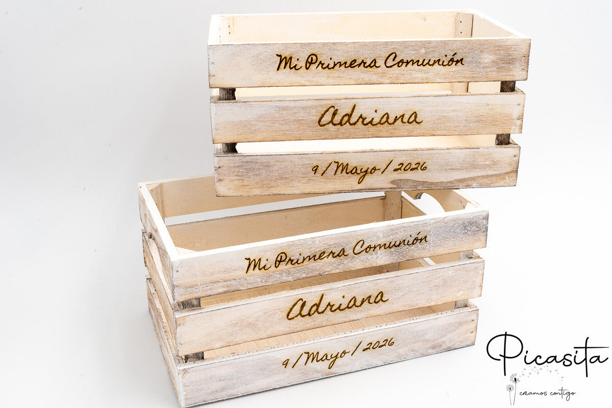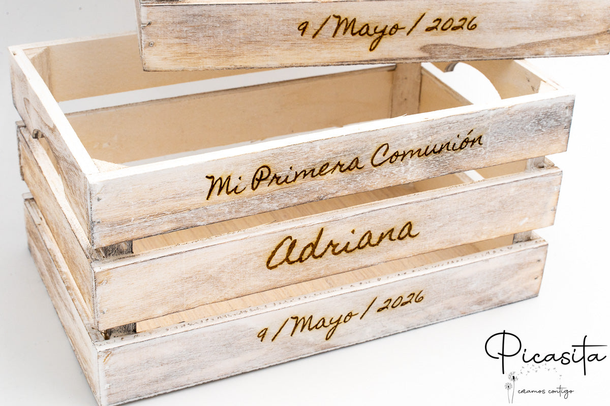 As comunhões também merecem uma apresentação irrepreensível. Esta peça funciona maravilhosamente como caixa rústica para lembranças da Primeira Comunhão. Imagina-a cheia de recordações ou saquinhos de doces, personalizada com o nome do menino ou menina. O seu desenho intemporal permite que, após o evento, seja reutilizada no quarto infantil. Se procuras uma verdadeira caixa rústica para lembranças da Primeira Comunhão, a versão em pinho natural ou branco decapado é uma escolha segura.