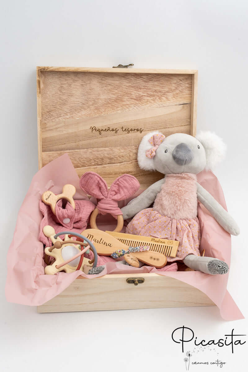 A primeira impressão é fundamental ao oferecer a recém-nascido. O nosso exclusivo conjunto apresenta-se numa delicada e resistente caixa de madeira clara, equipada com um fecho metálico de estilo vintage que confere um toque rústico e extremamente elegante. Ao abrir a tampa, a frase gravada "Pequenos tesouros" dá as boas-vindas a uma cuidada seleção de artigos, repousando sobre um suave papel de seda.