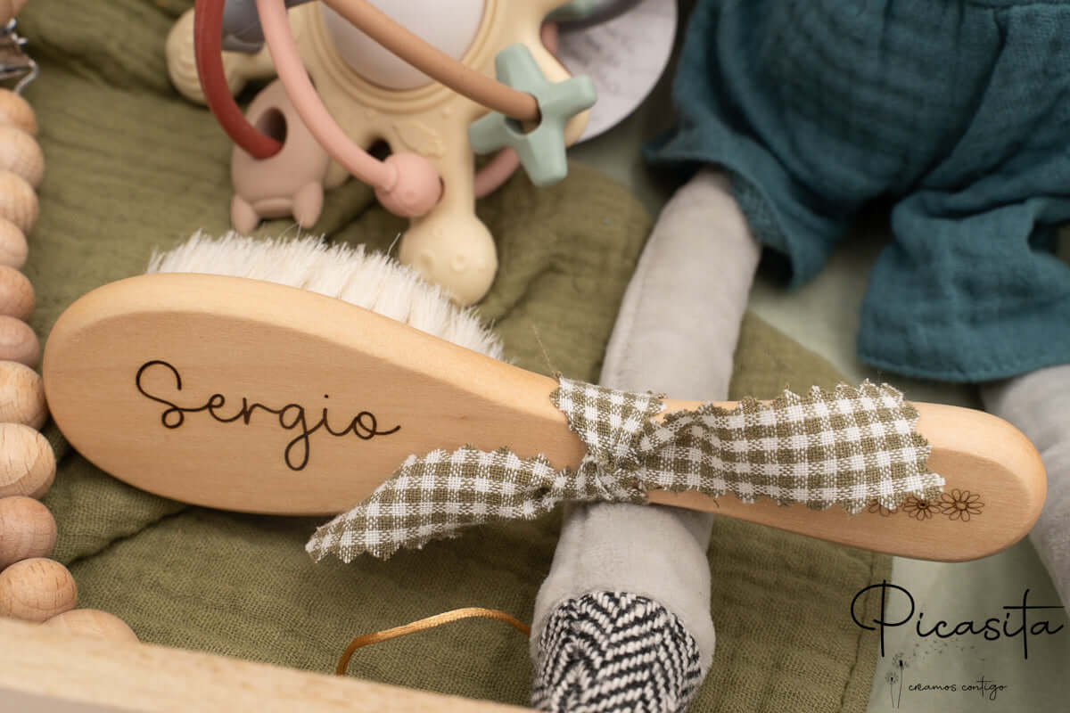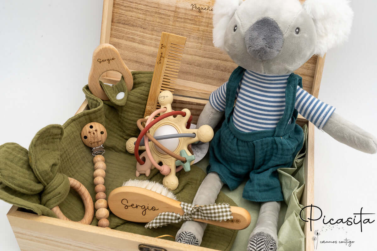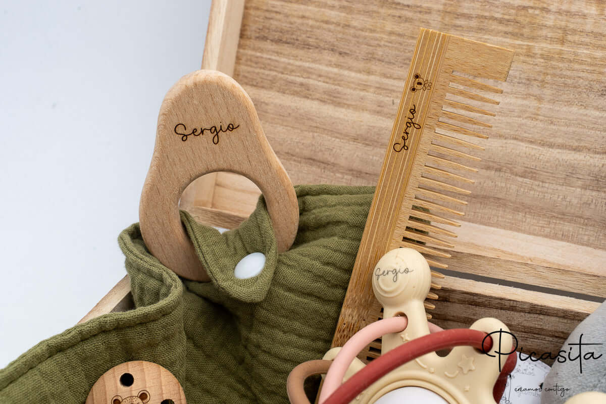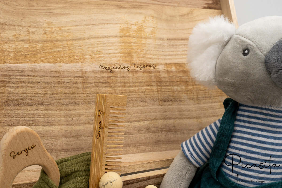 O que realmente eleva este conjunto e o torna o presente para bebé definitivo é a nossa técnica de personalização a laser. Este método não utiliza tintas nem produtos químicos; o laser queima subtilmente a superfície da madeira, deixando um tom tostado elegante e permanente. Gravamos o nome do pequeno na tampa do baú, no cabo ergonómico da escova, no pente de bambu, na presilha do prendedor de chucha (junto a uma doce carinha de coala) e na peça central do chocalho. É um detalhe 100% seguro e eterno.