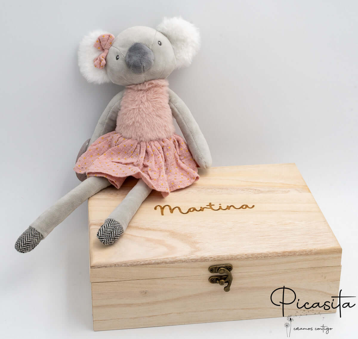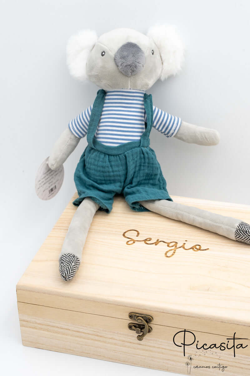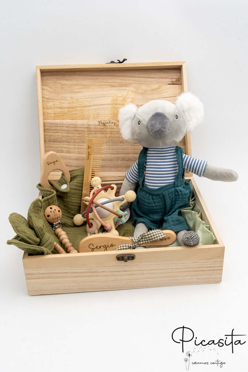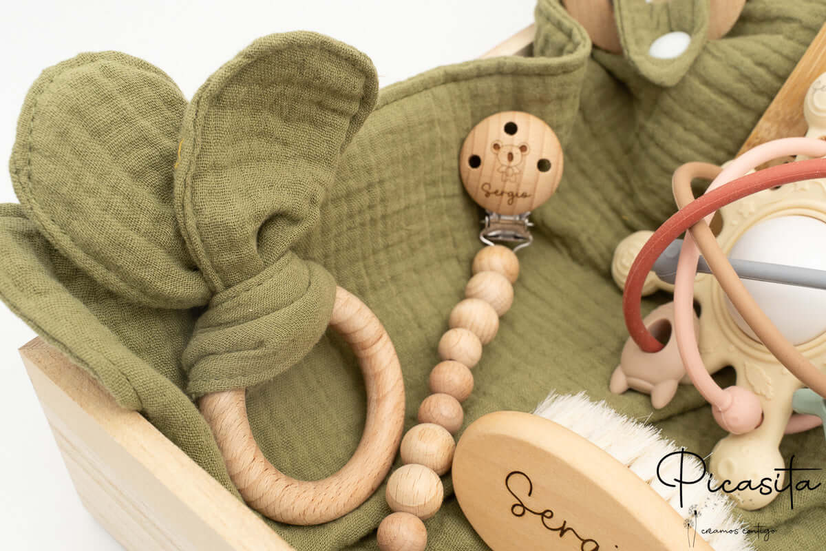 O que realmente eleva este conjunto e o torna o presente para bebé definitivo é a nossa técnica de personalização a laser. Este método não utiliza tintas nem produtos químicos; o laser queima subtilmente a superfície da madeira, deixando um tom tostado elegante e permanente. Gravamos o nome do pequeno na tampa do baú, no cabo ergonómico da escova, no pente de bambu, na presilha do prendedor de chucha (junto a uma doce carinha de coala) e na peça central do chocalho. É um detalhe 100% seguro e eterno.