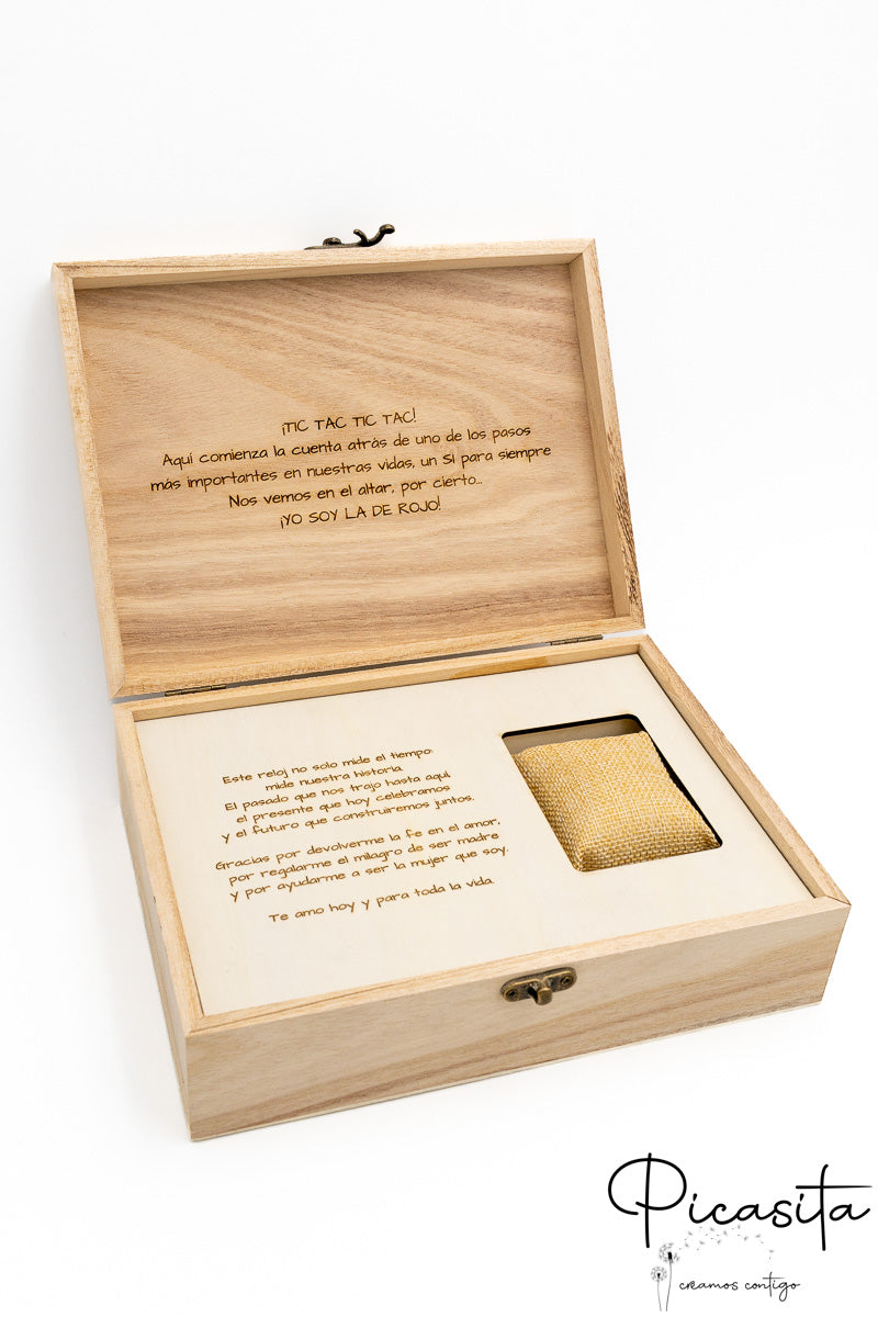 Esta caixa para relógio destaca-se pela sua leveza e acabamento natural, permitindo que a gravação a laser de alta precisão realce cada palavra da vossa mensagem. Dependendo da disponibilidade, as dimensões podem ser de 25 x 19 cm ou 29 x 22 cm, oferecendo um espaço generoso para que o relógio noivo casamento descanse sobre a sua almofada incluída. Ao escolher esta caixa de relógio, está a apostar num detalhe que o noivo conservará para sempre na sua mesa de cabeceira, recordando o vosso presente de relógio todas as manhãs.
