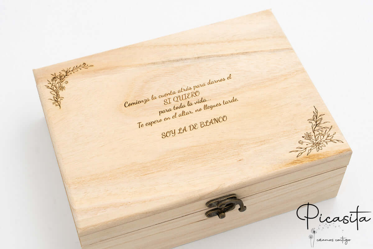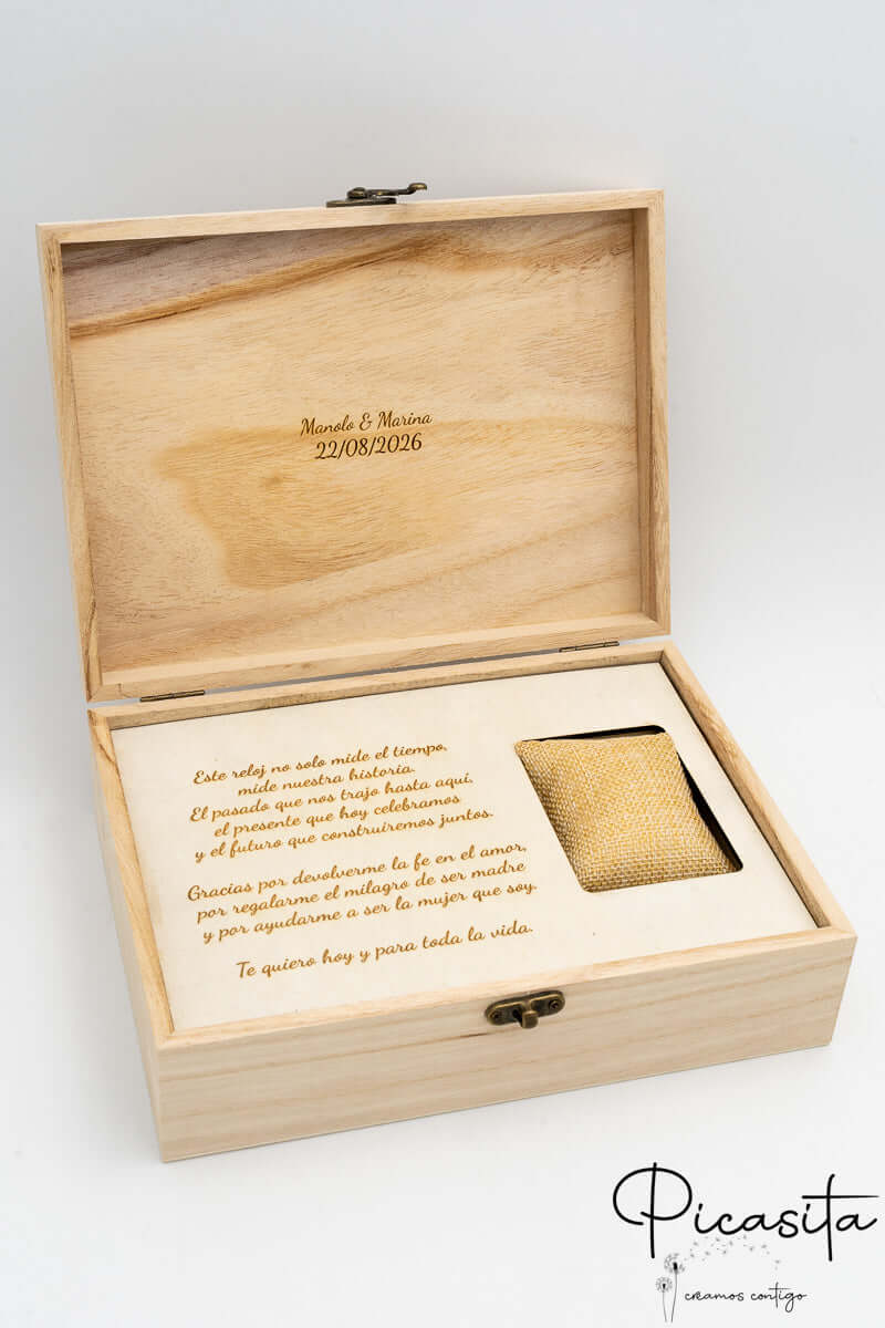 Cada peça foi montada a pensar na estética rústica, no aconchego e na funcionalidade. Conta com um precioso fecho metálico de estilo vintage que aporta um toque clássico e seguro. A sua estrutura em madeira leve torna-a fácil de manusear nos momentos nervosos antes da cerimónia. Um relógio com dedicação apresentado numa caixa que também traz gravadas a laser palavras de afeto inesquecíveis torna-se num tesouro familiar inestimável. A gravação queima a madeira deixando um tom tostado elegante e permanente que resistirá ao passar do tempo. Descobre mais opções para convites e celebrações em Nossa Loja.
