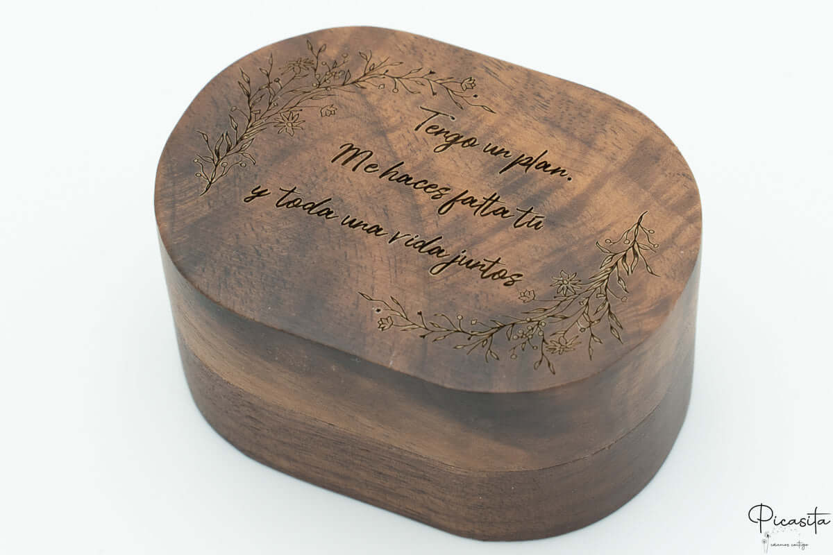 O que realmente diferencia uma caixa para anel de pedido comum de uma da picasita é a personalização. Graças à nossa tecnologia de gravação a laser, podemos gravar nomes, datas ou frases na madeira. Além disso, oferecemos um acabamento de luxo: a possibilidade de preencher a gravação com tinta dourada ou prateada, conferindo um contraste sofisticado e legível à tua caixa de pedido.