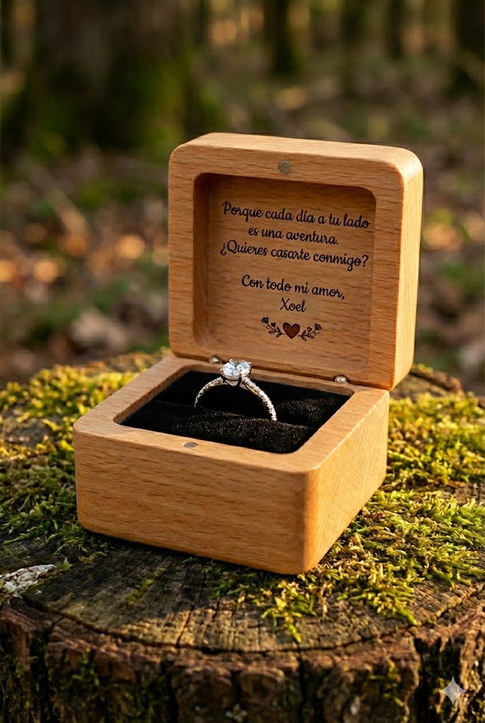 Explora toda a gama em Nossa Loja e encontra essa caixa para anel de pedido que fará com que o "sim" seja inesquecível. Lembra-te que, mesmo que procures uma caixa de anel ou uma caixa de pedido tradicional, o calor da madeira natural supera sempre as caixas de plástico convencionais.