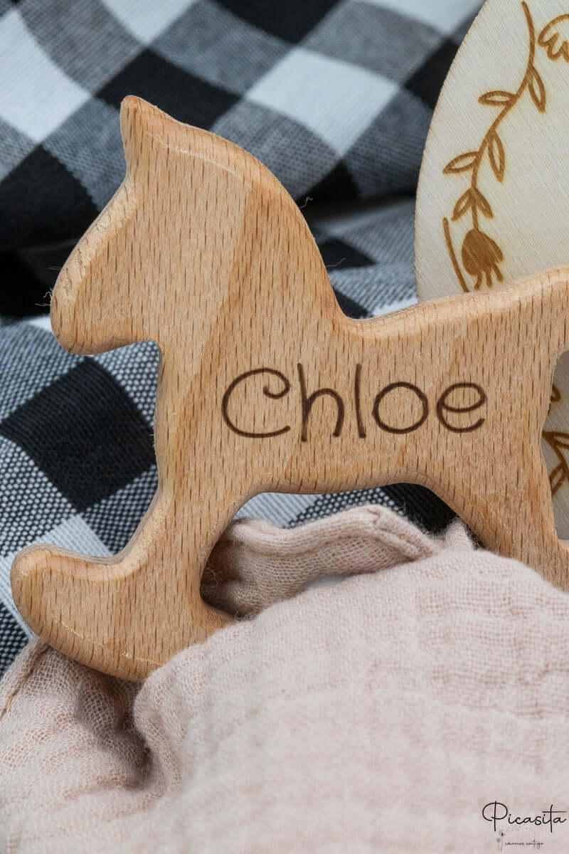 O que diferencia a nossa cesta bebé personalizada é o acabamento profissional e seguro. Na Picasita.es utilizamos laser de alta precisão para gravar o nome e um doce animalinho nas peças de madeira e silicone. Este método não utiliza tintas nem químicos; o resultado é uma gravação monocromática em cor cinza escuro que é permanente e totalmente segura, pois nunca se apagará com o uso ou as limpezas.