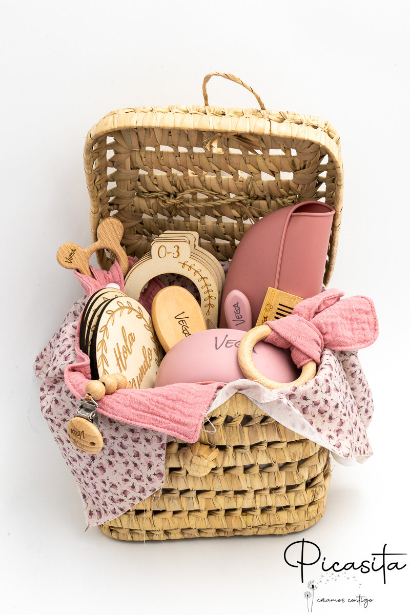 Procura um presente que combine emoção, utilidade e elegância? A nossa cesta bebé personalizada em tons de rosa é a solução ideal para dar as boas-vindas a um novo membro da família. Esta canastilha do bebé foi cuidadosamente desenhada, selecionando produtos de alta qualidade que acompanharão os pais nos momentos mais importantes do dia a dia. Apresentada numa preciosa cesta bebé de folha de palma trançada à mão de forma artesanal, é o presente para recém-nascido mais completo e estético que pode encontrar.