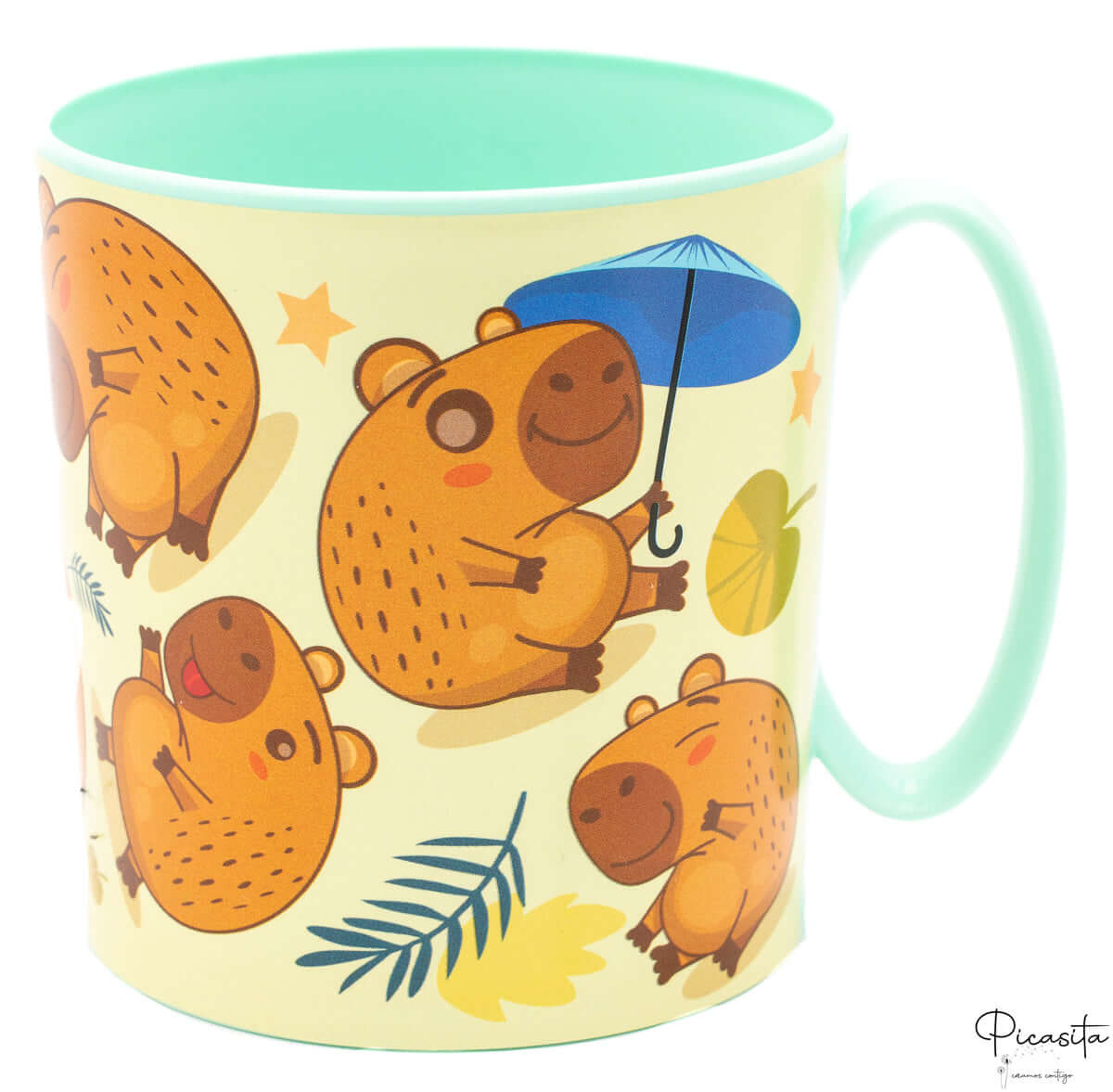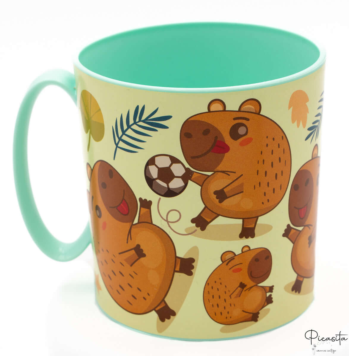 A estética desta caneca capibara conquista à primeira vista. Apresenta ilustrações vibrantes de capibaras em situações divertidas: a jogar futebol, a proteger-se do sol com um guarda-sol e a desfrutar da natureza. O interior e a pega em verde menta dão-lhe um toque fresco e moderno. Embora a gravação do nome seja eterna, lembra-te que a impressão do desenho pode sofrer desgaste com os anos e lavagens intensivas, algo natural em produtos de polipropileno com licença oficial.