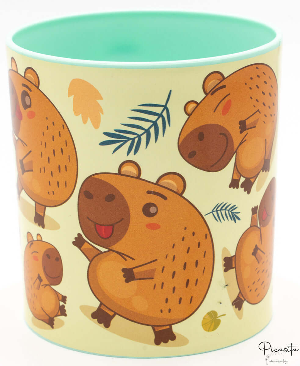 Este copo de capibara é fabricado em polipropileno, um plástico flexível e muito resistente a impactos, muito mais duradouro do que a cerâmica ou o vidro para um ambiente escolar.