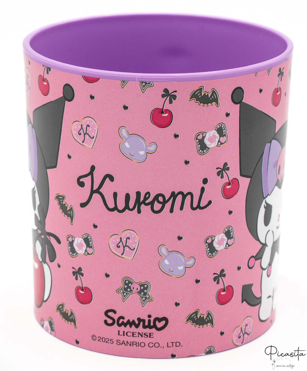 Este artigo conta com licença oficial da Sanrio, o que garante um design autêntico e fiel à personagem. Visualmente, a caneca Kuromi destaca-se pelo seu exterior rosa vibrante decorado com motivos de cerejas, morcegos, corações e a icónica Kuromi com o seu laço roxo. O interior em cor roxa cria um contraste fascinante que encanta os fãs. Com dimensões de 9,0 cm de altura e 7,0 cm de largura, tem o tamanho ergonómico ideal para que as mãos pequenas a segurem com total segurança.