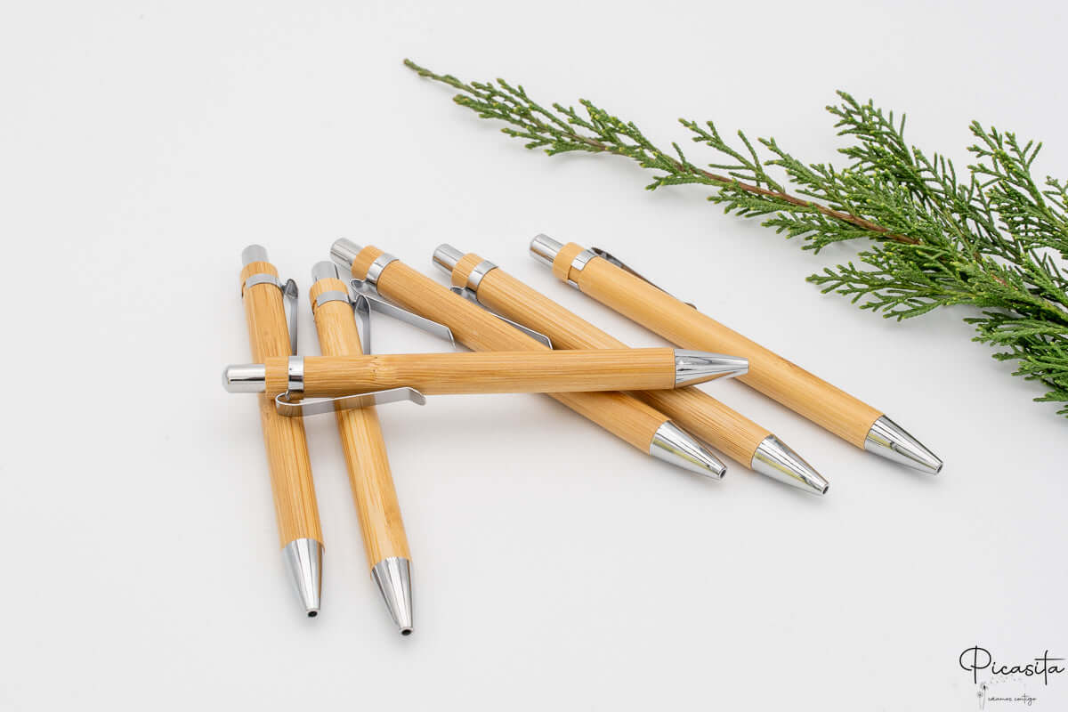 Na Picasita acreditamos que a simplicidade é a chave da elegância. A nossa caneta personalizada fabricada em madeira de bambu é muito mais do que um acessório de escrita; é um detalhe sustentável que reflete carinho e atenção ao pormenor. Com um corpo em madeira natural e um clip metálico robusto, esta caneta para convidados torna-se a lembrança perfeita para qualquer tipo de celebração.