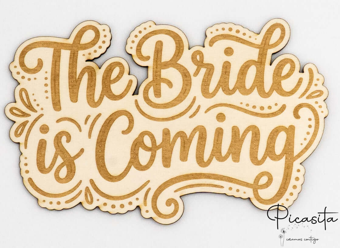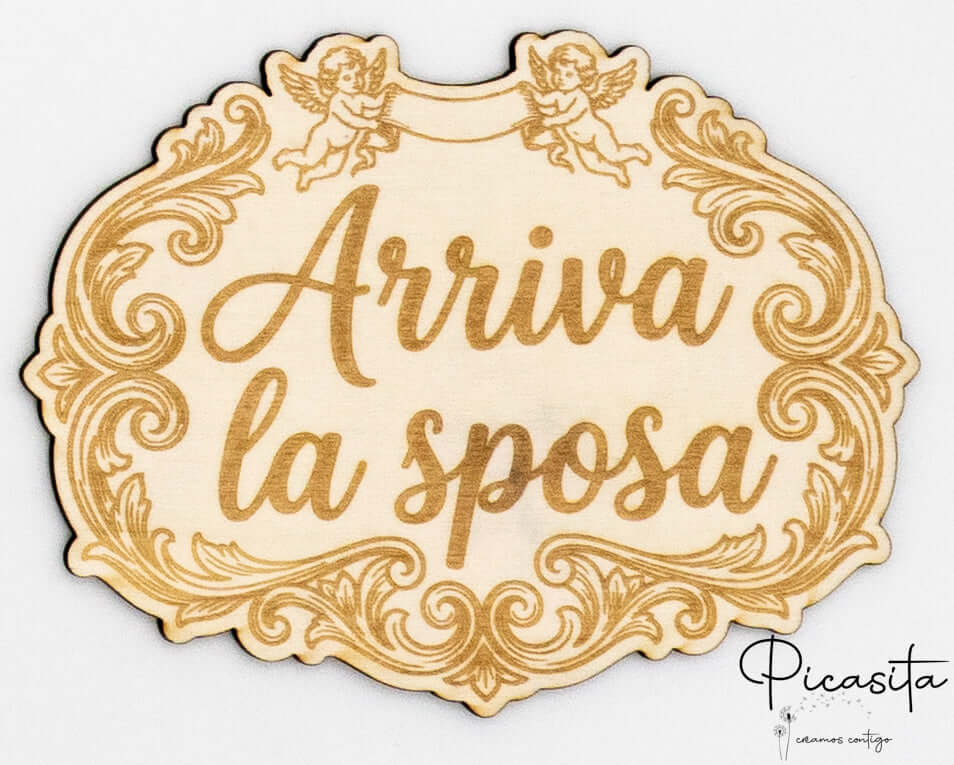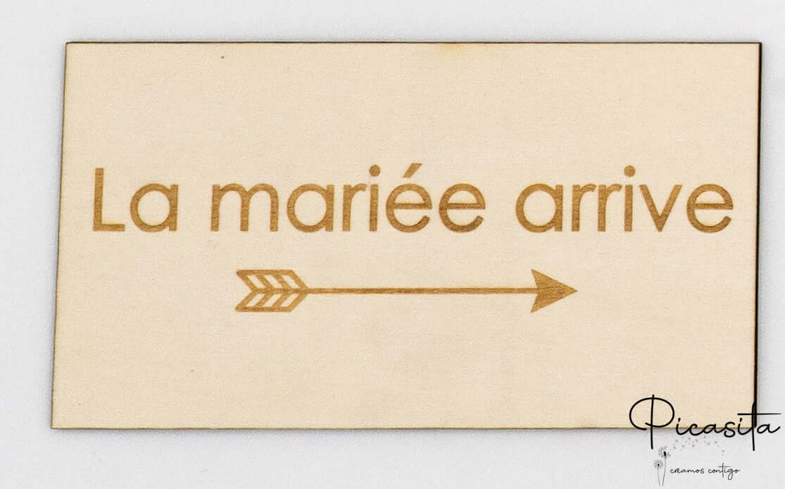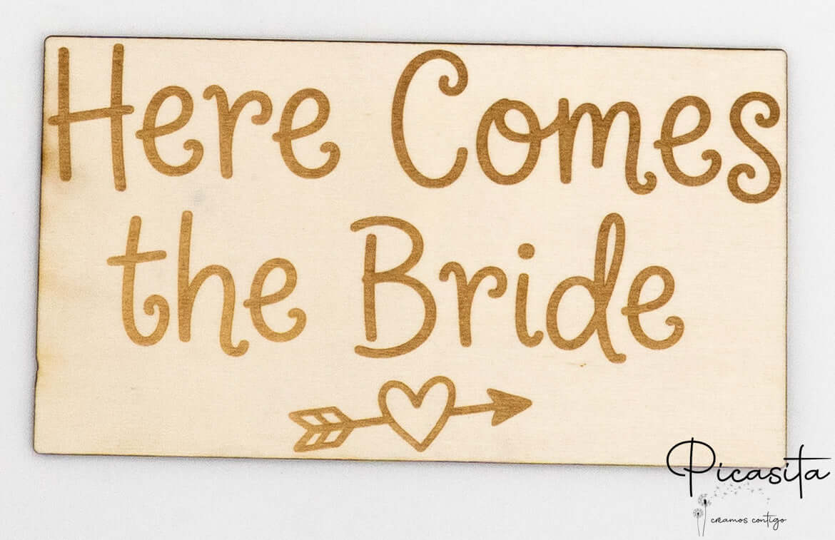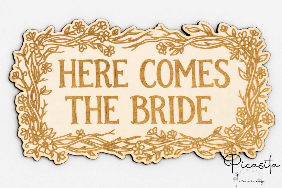 Sabemos que cada casamento é único, por isso oferecemos total flexibilidade na mensagem. Pode optar pela frase tradicional ou escolher a variante aqui chega a noiva se se adequar melhor ao seu estilo. Fabricado em madeira de 4mm de espessura, este letreiro é suficientemente leve para que as crianças o possam transportar sem esforço, mas robusto para durar como uma recordação eterna.