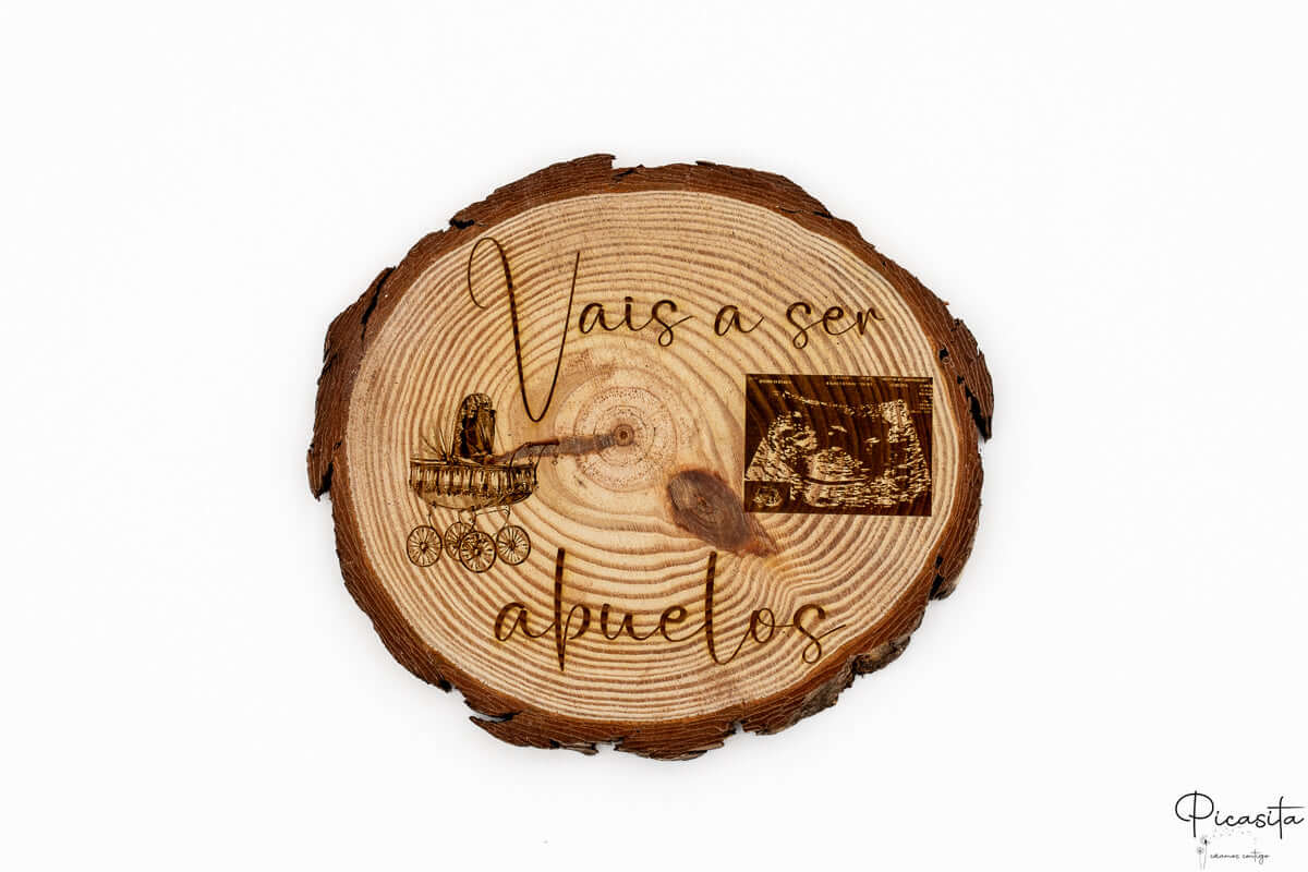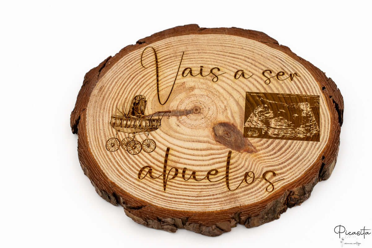 Gravação de ecografia: Podemos integrar a primeira imagem do teu bebé diretamente na madeira, criando um impacto visual e emocional inigualável junto ao texto "vão ser avós".