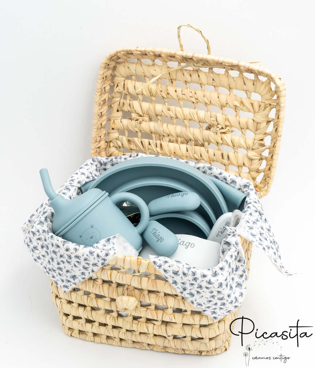 A base deste maravilhoso presente para recém-nascido é uma preciosa mala de folha de palma tecida à mão. É importante lembrar uma regra de segurança vital: esta cesta é exclusivamente um recipiente de apresentação para entregar o presente de forma elegante e para decorar o quarto ou guardar brinquedos posteriormente; em nenhuma circunstância deve ser usada como berço para colocar o bebé no seu interior. No seu interior, a qualidade é indiscutível: acessórios de madeira natural, escovas de cerdas extra suaves para o delicado couro cabeludo e chupetas que cumprem todas as normas europeias. Se procuras inspiração e presentes feitos com o coração, volta ao início de picasita e apaixona-te pelo nosso catálogo.