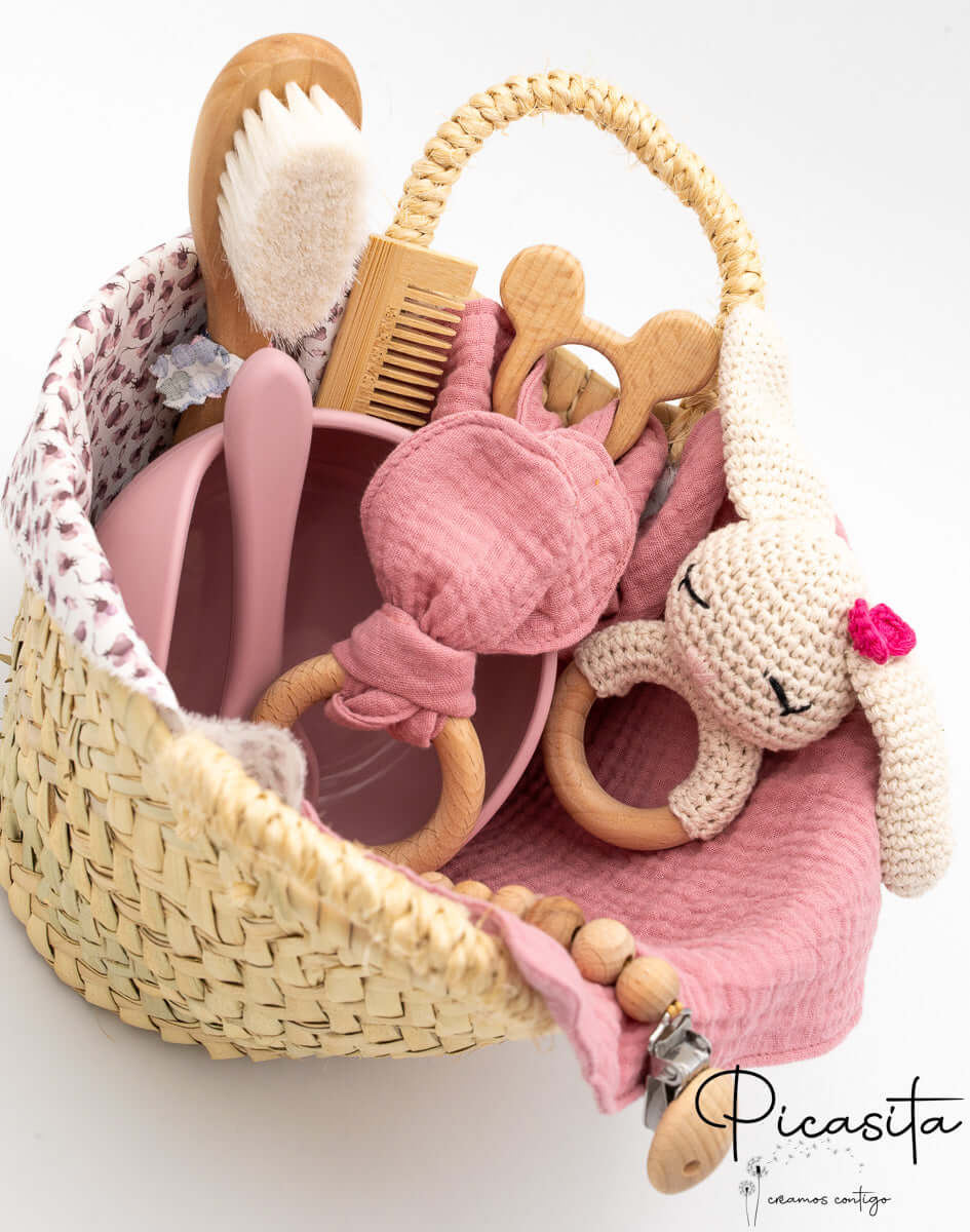 A nossa cesta de recém-nascido é uma das opções mais completas do nosso catálogo. Cada elemento foi selecionado pela sua utilidade e segurança:
