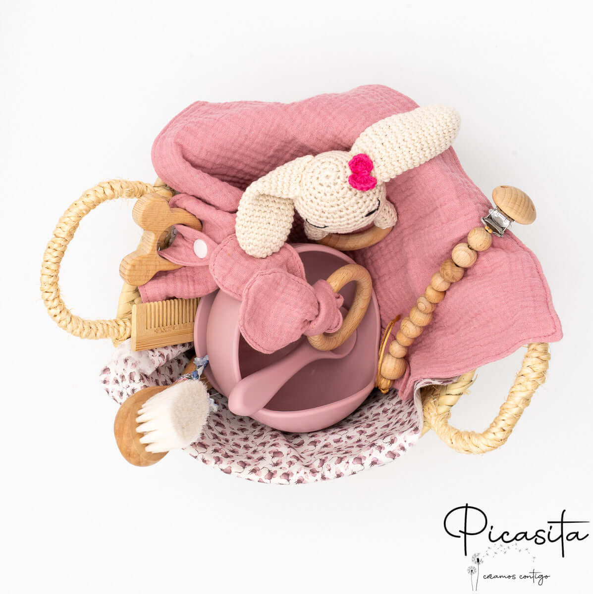 Na picasita.es sabemos que a chegada de um bebé é um momento único que merece um detalhe à altura. Por isso, desenhámos este presente de recém-nascido pensando na praticidade diária dos pais e na máxima delicadeza para a pele do bebé. Este conjunto não é apenas um pacote de produtos, é uma experiência de boas-vindas que funde o calor dos materiais naturais com a exclusividade da personalização.