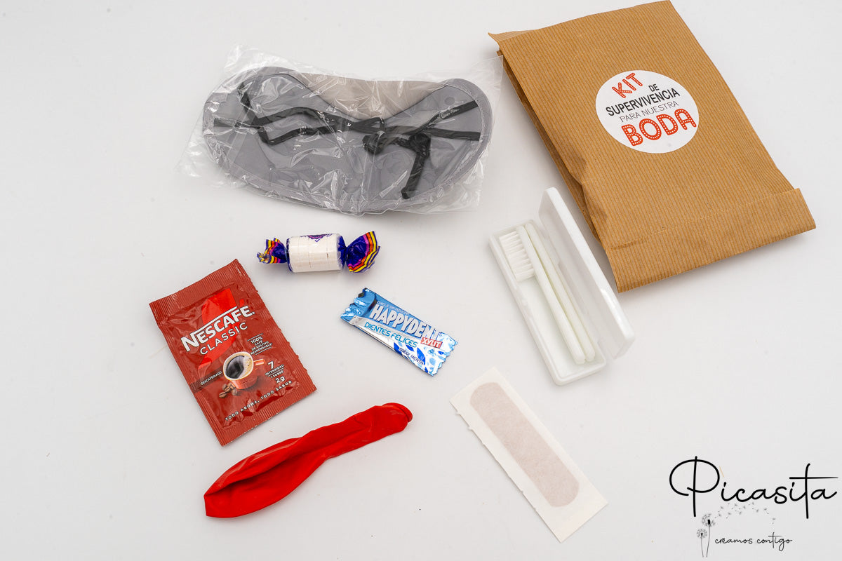 Cada "kit" ou saquinho individual incluído contém: um saco de Nescafé, um chiclete Happydent, um penso rápido, uma escova de dentes, uma máscara, rebuçados e um balão. O número de saquinhos depende do tamanho do cesto que escolheres.