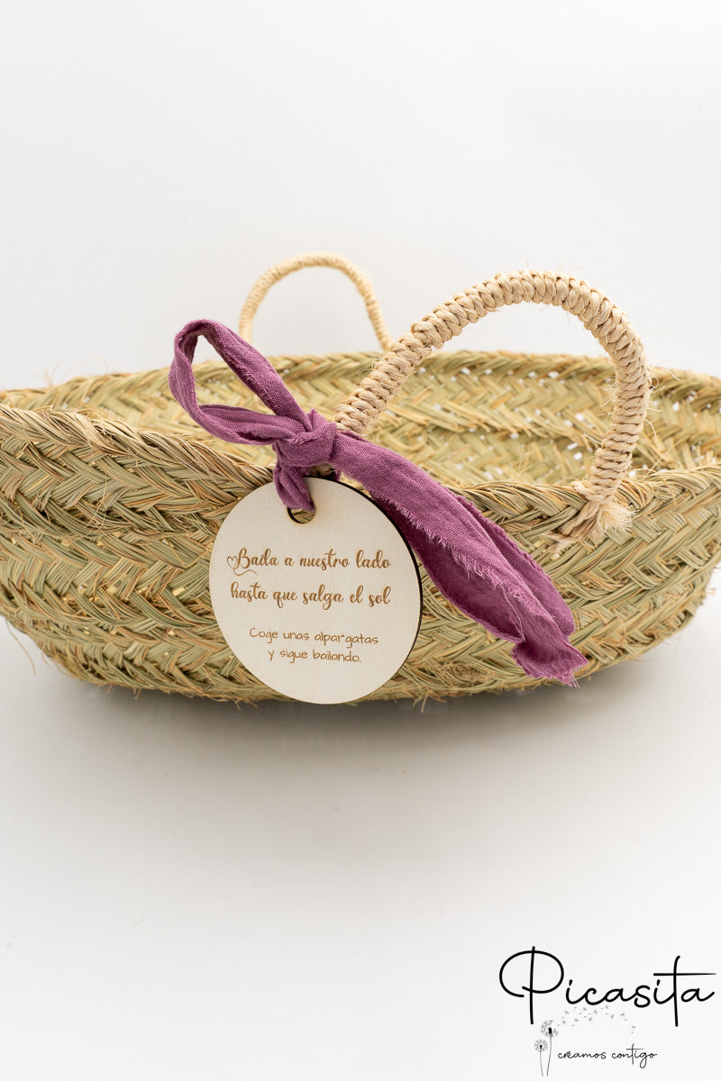 O que torna especial esta cesta de alpargatas de casamento é a sua capacidade de personalização. Não vendemos uma cesta genérica; criamos a tua. Incluímos um elegante círculo de madeira gravado a laser de alta precisão (uma queimadura superficial escura e permanente, sem tintas) com os vossos nomes, a data ou uma frase divertida que convide à pista de dança. Além disso, decoramos as pegas com uma tira de tecido na cor que escolheres para que a Cesta para alpargatas combine perfeitamente com a paleta de cores do teu evento.