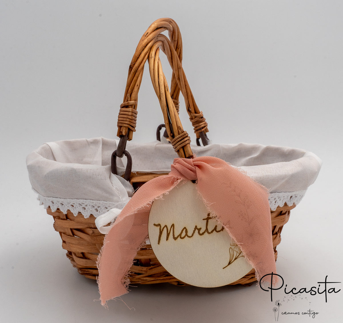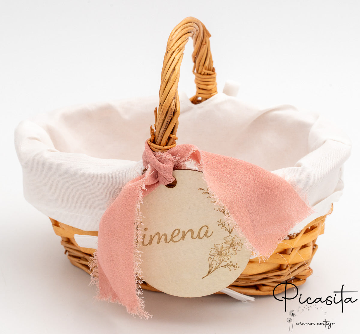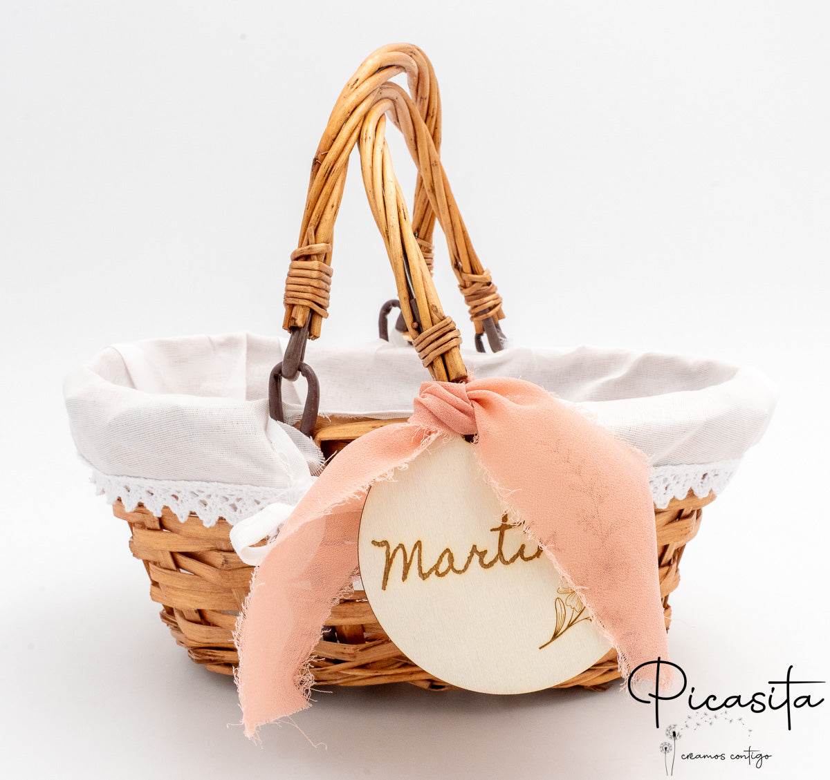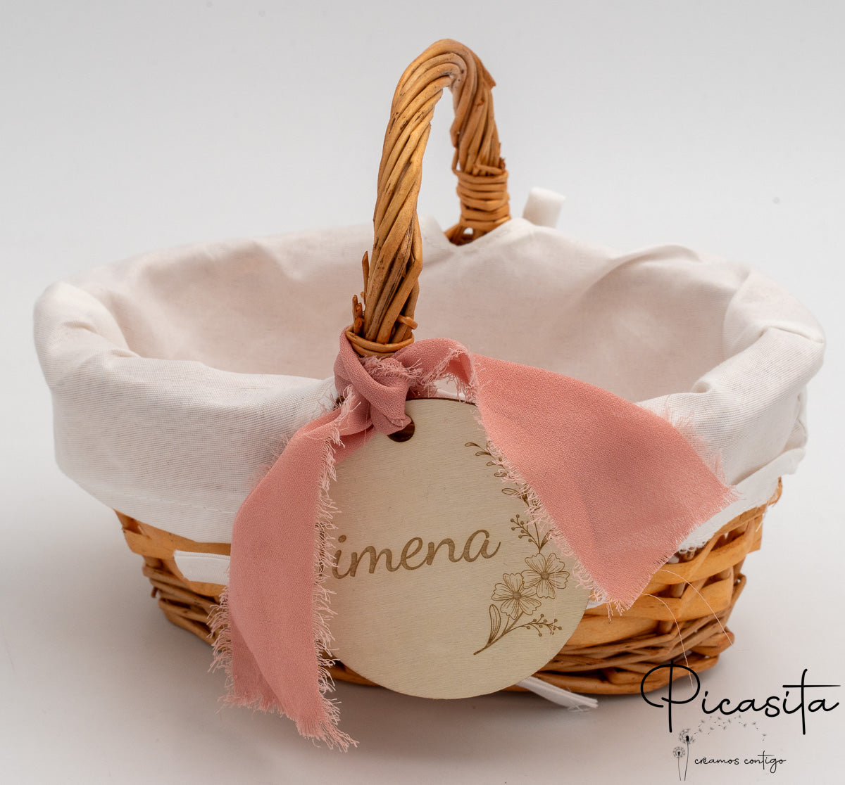Para adicionar um toque de sofisticação e ternura, cada cesta para daminhas vem adornada com lindas fitas de tecido (que incluem laços com bordas desfiadas em estilo boho, delicados detalhes em renda) e uma bonita medalha redonda de madeira natural que pende da pega. Alguns dos nossos modelos incorporam um prático forro interior de tecido branco ou um revestimento de plástico transparente, ideal para proteger o interior se decidires usar o cesto para daminhas com pétalas naturais ou artificiais que também podes descobrir explorando A Nossa Loja.