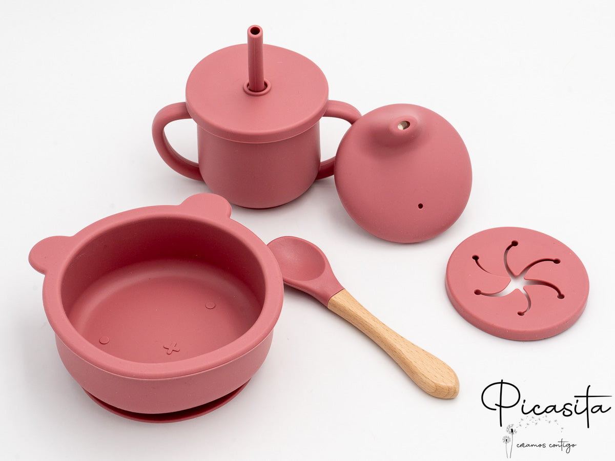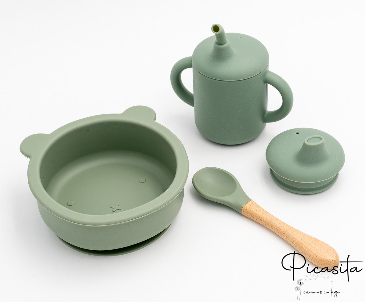 Sabemos que la seguridad y la limpieza son prioridades fundamentales para cualquier familia. Por ello, el bol de este conjunto de alimentación de bebe cuenta con un divertido y dulce diseño de orejitas de oso y una potente base de succión. Esta ventosa se adhiere firmemente a la bandeja de la trona o a la mesa, evitando accidentes, derrames y los clásicos 'platos voladores'. El vaso de aprendizaje evolutivo es una verdadera joya funcional: incluye dos prácticas tapas de silicona intercambiables (una con pajita estriada antiahogo y otra tipo boquilla) y asas ergonómicas perfectas para sus pequeñas manos en desarrollo. La cuchara, por su parte, combina magistralmente una punta de silicona suave con un robusto, cálido y elegante mango de madera de haya natural.