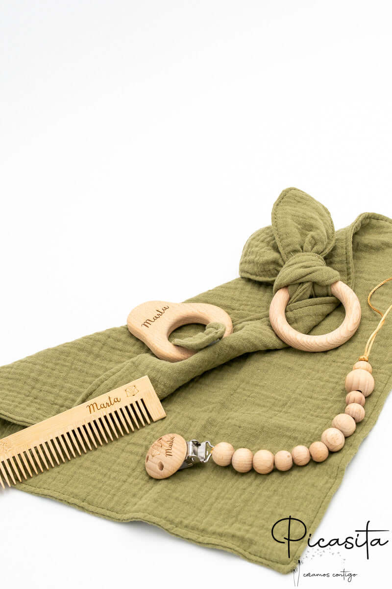 - 🌟 Muselina de apego extra suave: Um básico indispensável em qualquer cesta de bebé. Esta muselina atua como doudou, absorvendo o cheiro materno para acalmar o bebé instantaneamente. Oferecer muselina é oferecer versatilidade absoluta, pois serve para aconchegar, proteger do sol ou limpar. Além disso, esta muselina inclui uma pequena figura de madeira na sua extremidade que também personalizamos para ti.