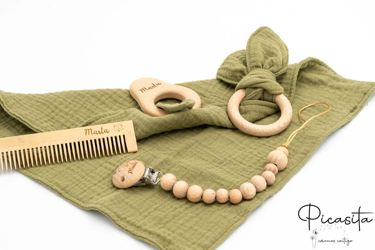 A verdadeira exclusividade deste presente para recém-nascido reside na sua personalização. Utilizamos a avançada técnica de gravação a laser, que queima subtilmente a superfície da madeira de faia da chupeta e da figura da muselina. Este método deixa um elegante e rústico tom tostado ou acinzentado que é 100% permanente, ecológico e seguro. Ao contrário dos autocolantes ou tintas que podem apagar-se ou ser tóxicos, o laser garante que o bebé pode manipular e levar a chupeta ou o mordedor à boca sem absolutamente nenhum risco. Oferecer muselina juntamente com estes belos acessórios de madeira natural é assegurar uma recordação inesquecível que os pais irão guardar para sempre.