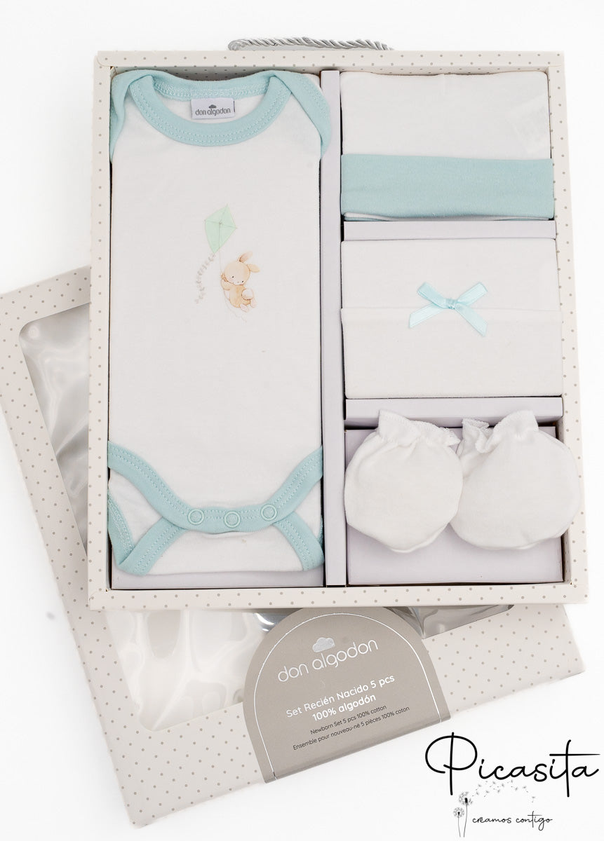Apresentado numa elegante caixa de presente com bolinhas, este conjunto primeira roupa inclui as peças essenciais que todo o bebé precisa ao nascer, destacando-se pelos seus desenhos doces e intemporais disponíveis em tons Azul, Rosa e Turquesa.