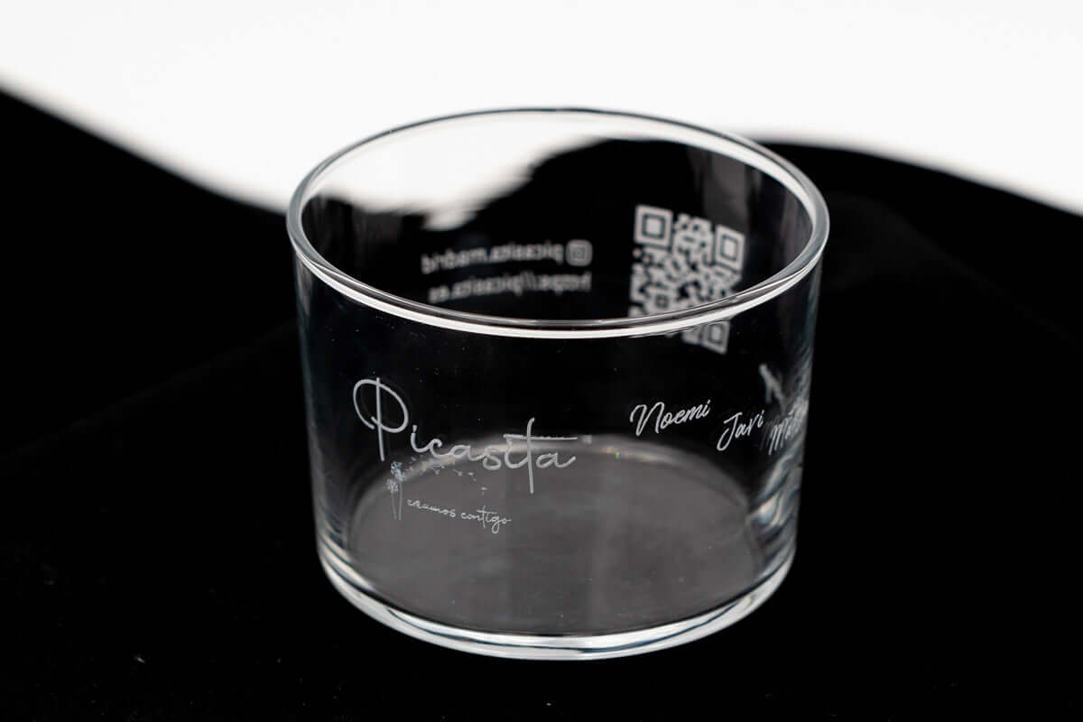 Para garantir um resultado ótimo, é fundamental que nos forneça o logótipo com a maior qualidade possível. Quanto melhor for o ficheiro original, maior será a nitidez da gravação final. Uma das grandes vantagens da nossa técnica é que a gravação não afeta a estrutura do cristal nem a sua resistência térmica: estes copos são totalmente adequados para micro-ondas.