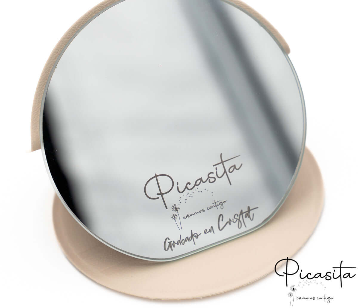 O que realmente faz com que este espelho personalizado se destaque sobre qualquer outro é a nossa inovação técnica no modelo médio. Enquanto em ambos os modelos gravamos o exterior, na versão de 9cm oferecemos a gravação direta sobre a superfície do espelho. Esta característica exclusiva aporta um toque de luxo inigualável que dificilmente encontrarás noutra loja, permitindo que o nome ou a data seja visível cada vez que se use o vidro.