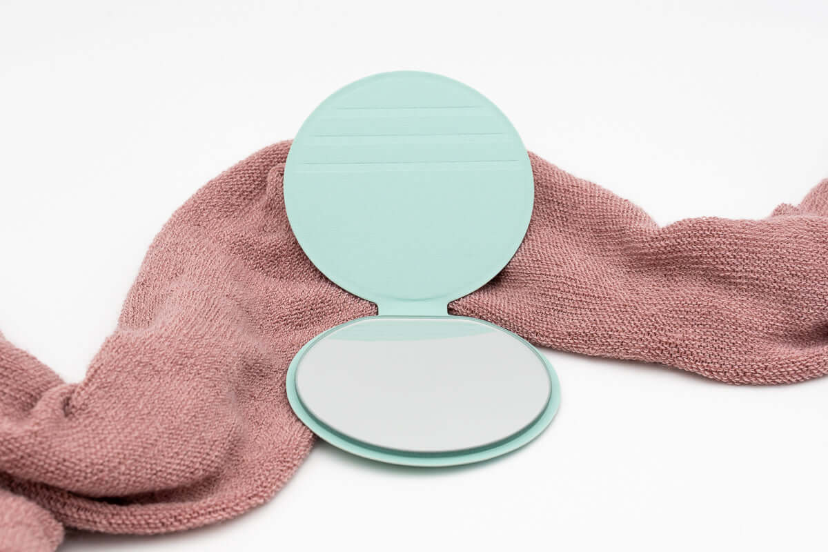 Modelo 8cm (Pequeno): Este espelho presente de casamento é mais fino e flexível. O seu design ultra fino torna-o no aliado perfeito para malas de mão pequenas ou clutches de festa. Está disponível numa bonita gama de cores: Rosa, Azul, Branco, Roxo e Cinzento.