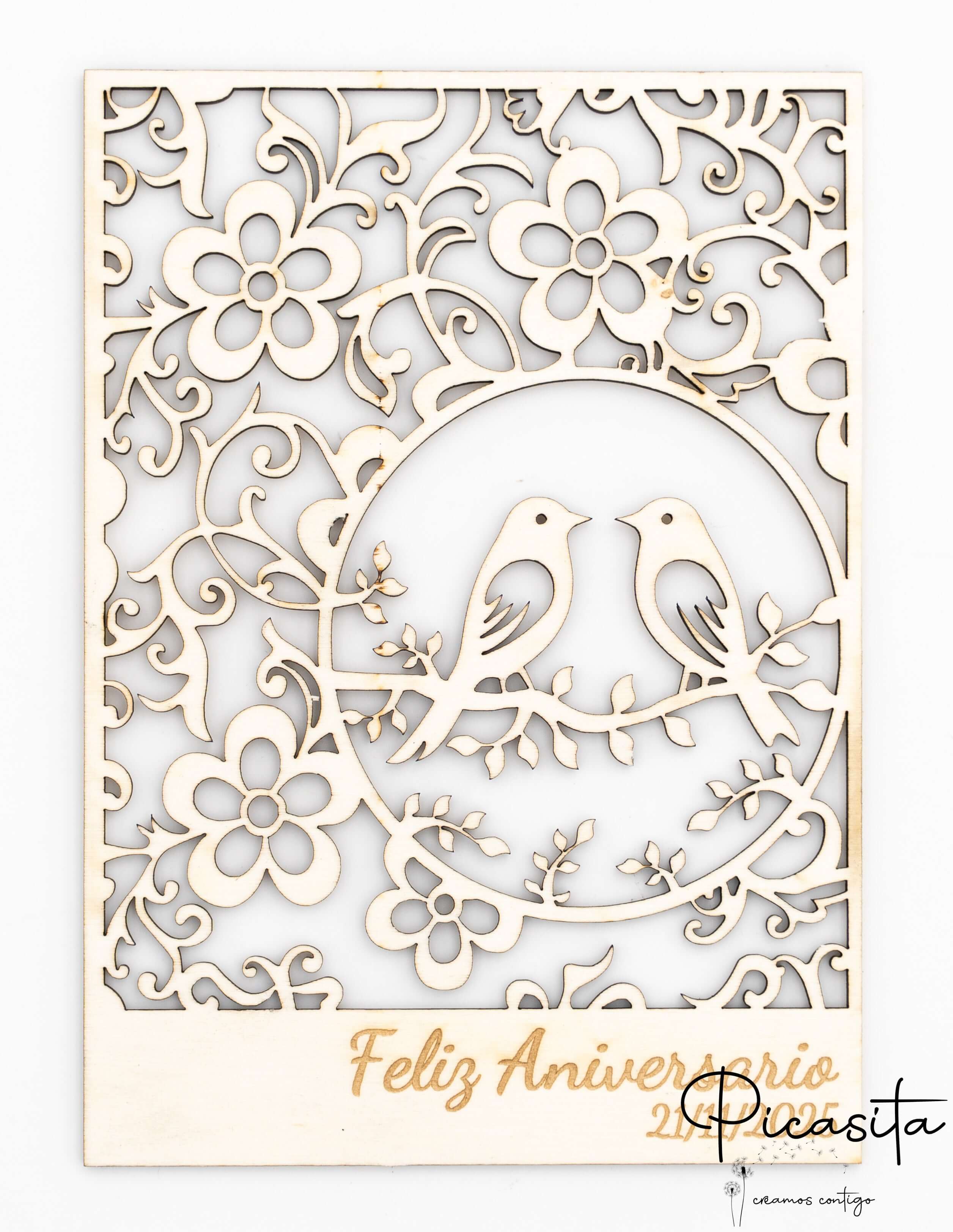 Modelo Pássaros (19x14cm): Uma representação poética da companhia e da harmonia, com dois pássaros rodeados por um intrincado recorte floral.