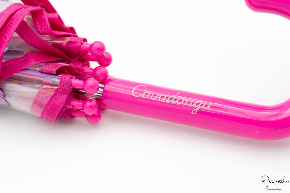 Na Picasita.es vamos um passo mais além. Personalizamos este guarda-chuva infantil princesas através de técnica de laser de alta precisão diretamente no cabo fúcsia. Este método cria uma gravação permanente de cor acinzentada que não se apaga, não se descola e resiste perfeitamente à humidade. Seja um guarda-chuva sereia, um guarda-chuva cinderela ou um guarda-chuva branca de neve, levar o seu nome gravado evitará confusões na escola ou no parque. A durabilidade do laser assegura que a marca pessoal acompanhe o guarda-chuva ariel durante toda a sua vida útil.