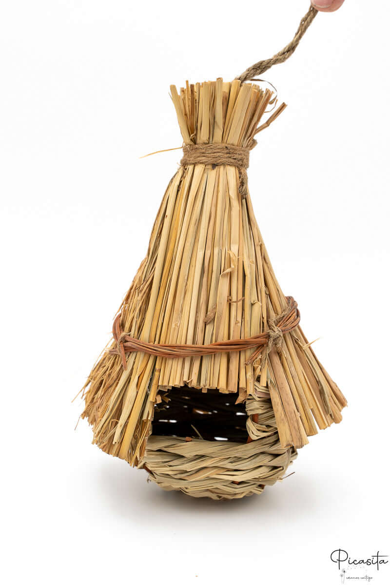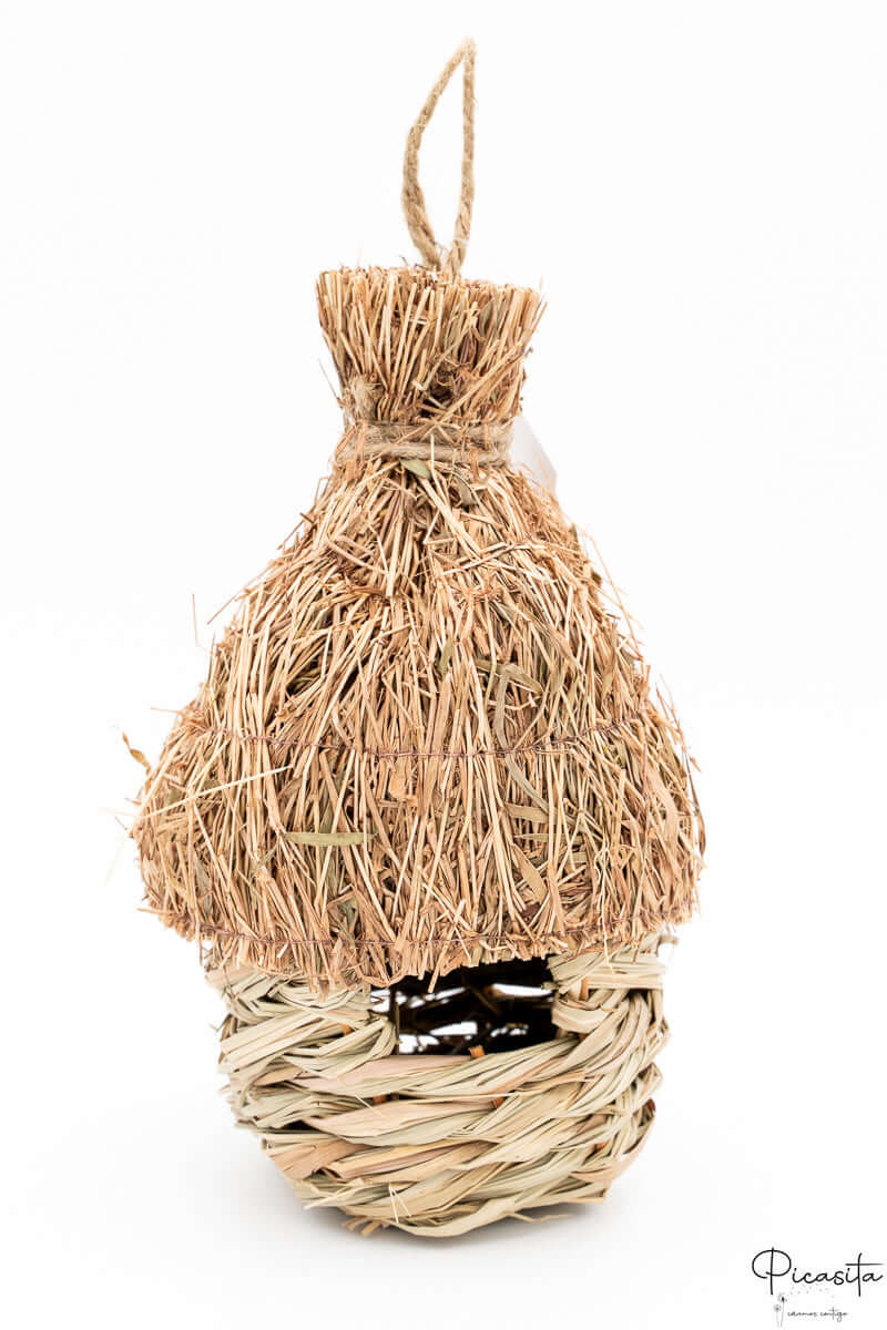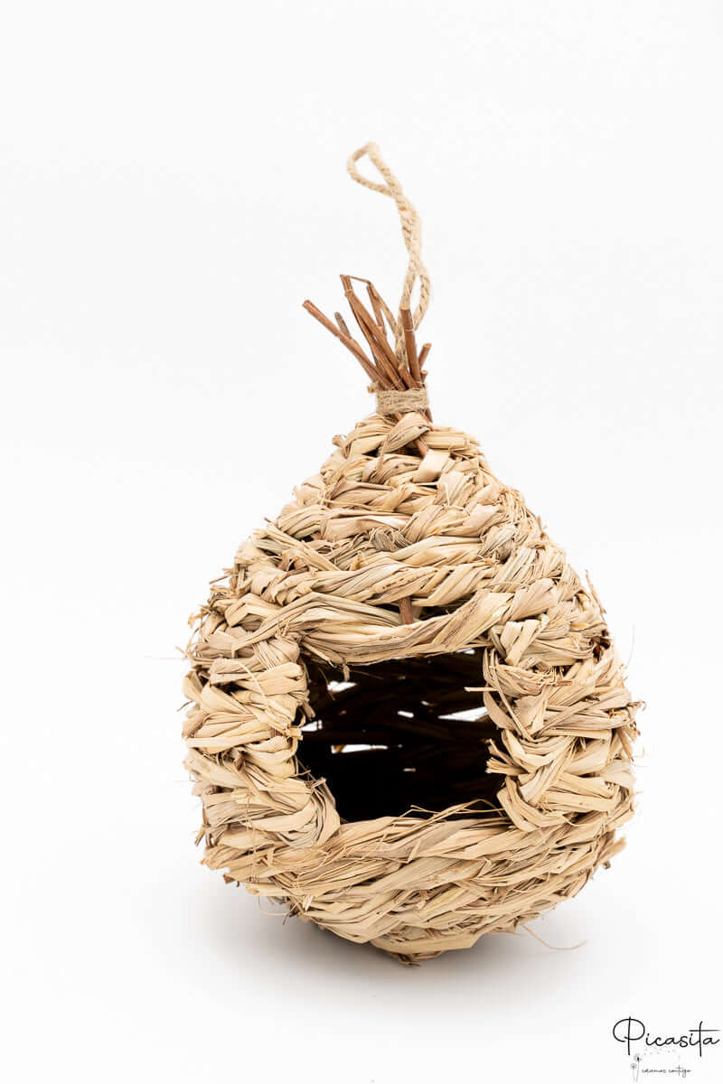 Este ninho de pássaro tem dimensões de 25x10 cm, ideal para aves pequenas de jardim como pardais, chapins ou chapins-azuis.
