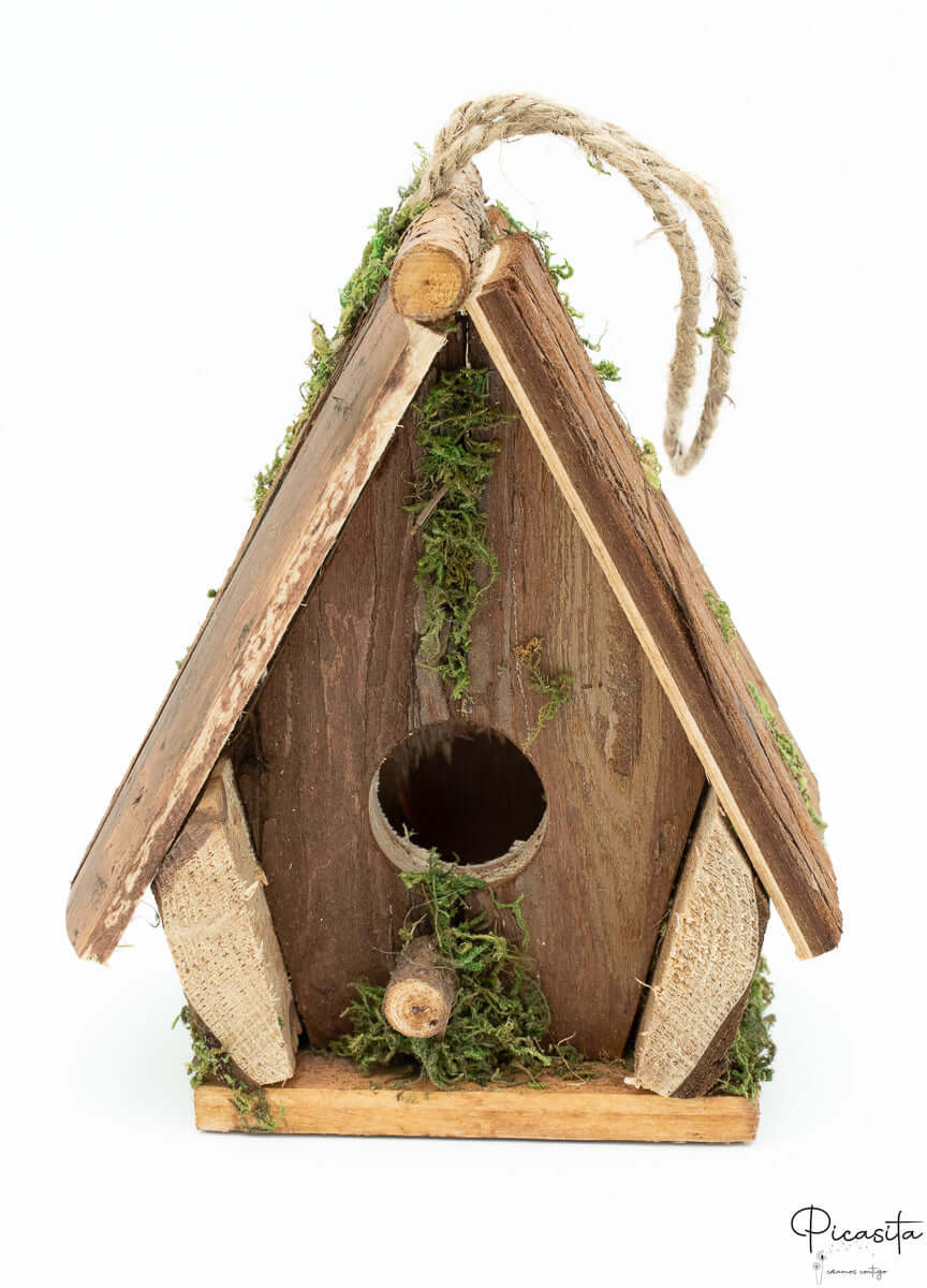 Materiais: Madeira natural, musgo, palha e corda de juta resistente para pendurar.