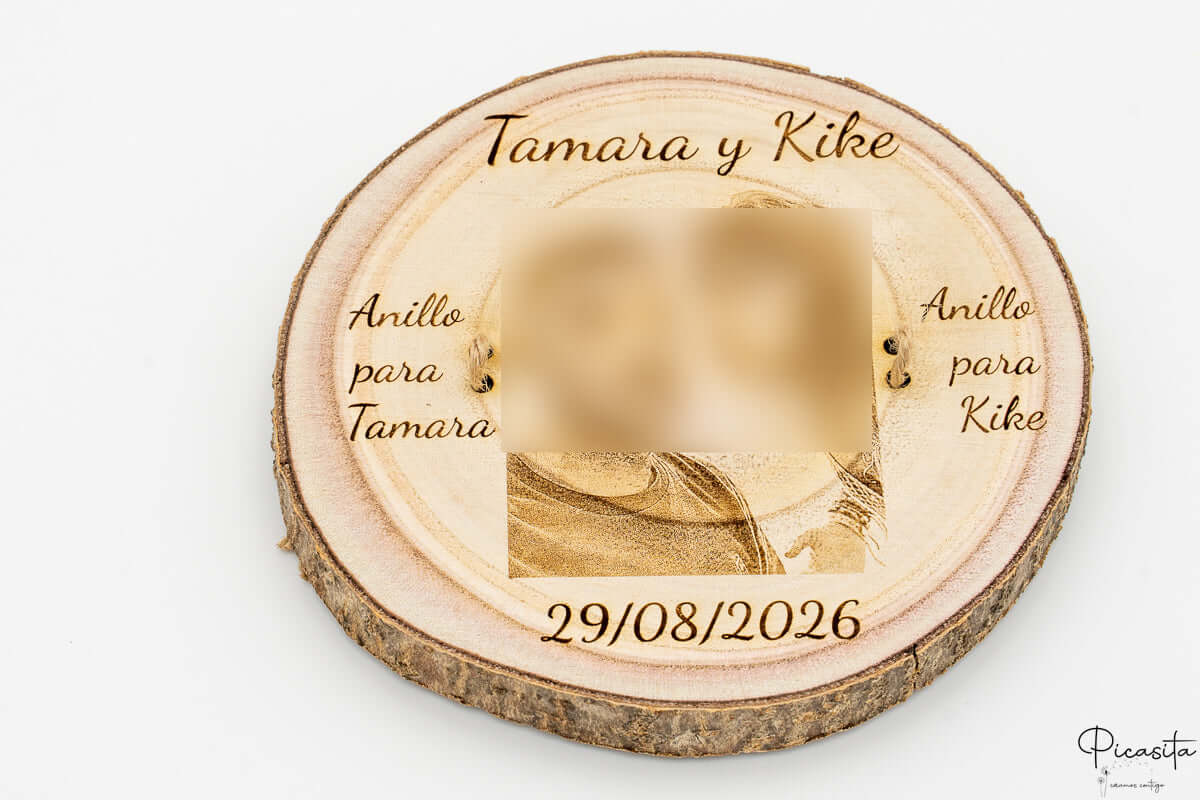 O que torna realmente especial este porta-alianças gravado é que se transforma numa tela para a vossa história. Graças à técnica de laser de alta precisão, podemos reproduzir a vossa fotografia favorita ou um design de texto elegante diretamente na madeira. É fundamental ter em conta que, por se tratar de uma gravação térmica, o resultado é monocromático e a nitidez final do porta-alianças dependerá diretamente da resolução e qualidade da imagem que nos fornecerem.