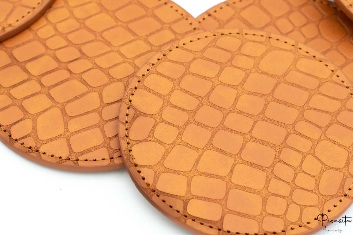 A singularidade dos nossos porta-copos imitação crocodilo reside na sua superfície. Fabricados com couro sintético de alta qualidade, apresentam um relevo detalhado que simula na perfeição a pele do réptil, proporcionando uma riqueza visual e tátil. A sua cor castanho claro, quente e versátil, realça o padrão, tornando-o num porta-copos castanho que se destaca pela originalidade.