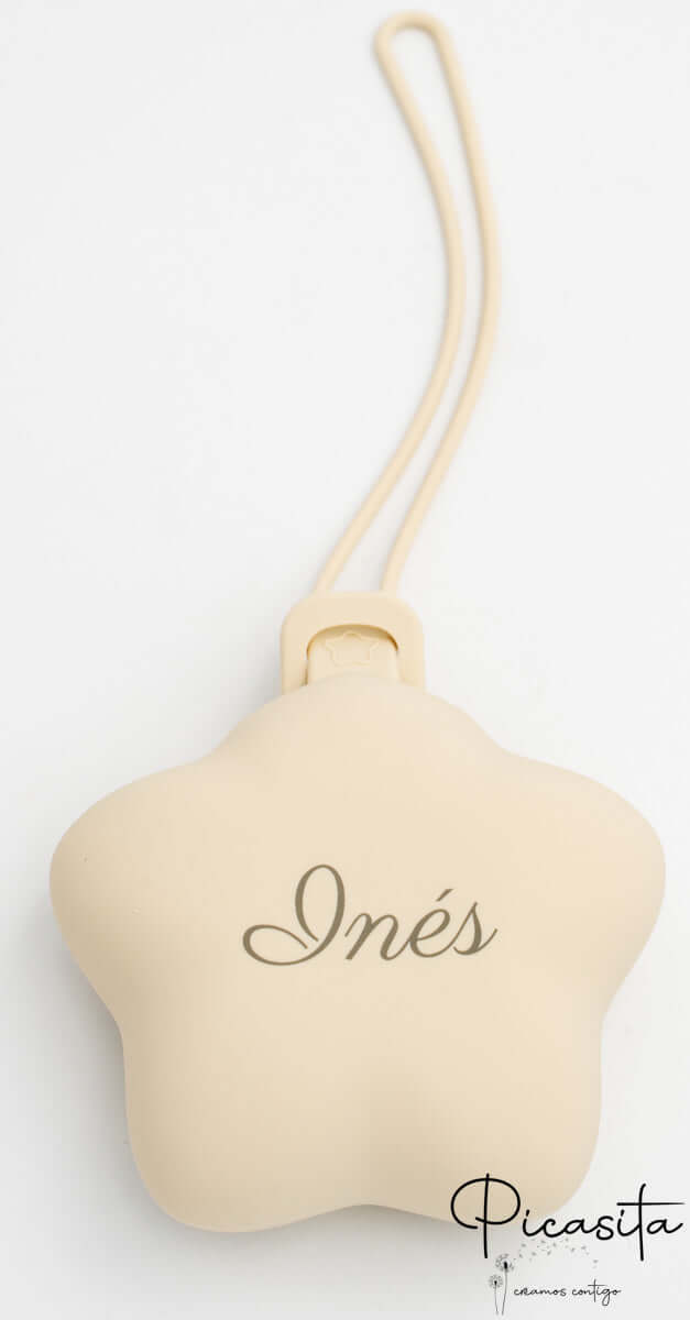 O que torna este produto verdadeiramente único é o seu nível de detalhe. Transformamos um acessório do dia a dia numa recordação especial ao oferecer-lhe um lindo porta-chupetas com nome. Utilizamos tecnologia de gravação a laser de alta precisão diretamente na superfície da estrela. Este método garante uma marcação permanente e segura que não se apaga com o uso diário nem com as lavagens, deixando um elegante tom cinzento escuro ou preto que contrasta maravilhosamente com as cores pastel disponíveis (Bege, Roxo e Salmão). É o detalhe ideal para oferecer a recém-nascidos ou para identificar facilmente os pertences na creche.