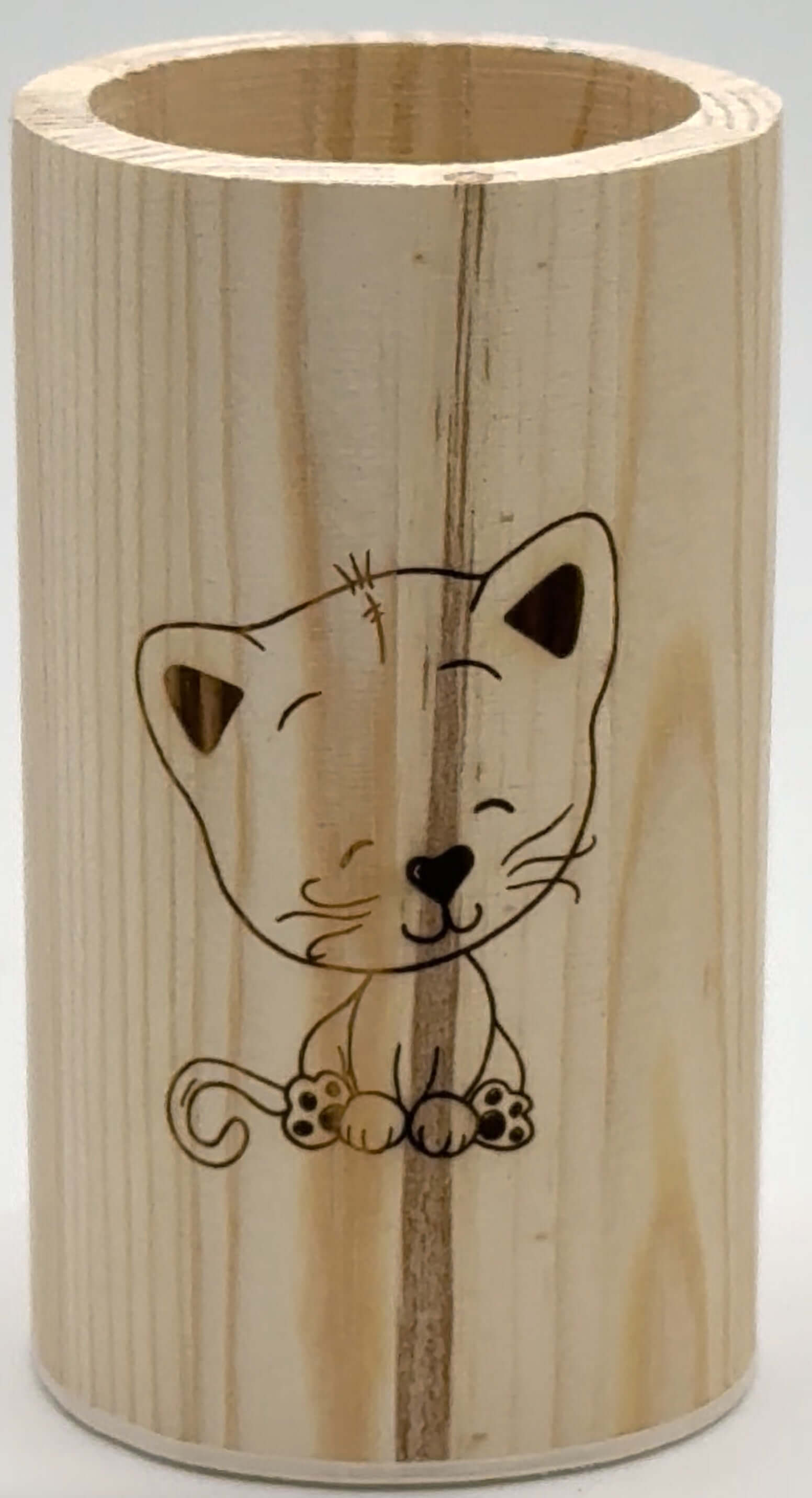Por se tratar de madeira de pinheiro autêntica, cada porta-lápis personalizado é único. Deves ter em conta que o veio da madeira é caprichoso: algumas zonas são mais densas que outras, o que faz com que a gravação a laser reaja de forma diferente, ficando algumas partes mais escuras que outras. Este efeito não é um defeito, mas sim a prova de que estás perante um produto natural e genuíno, como se pode apreciar no vídeo demonstrativo.