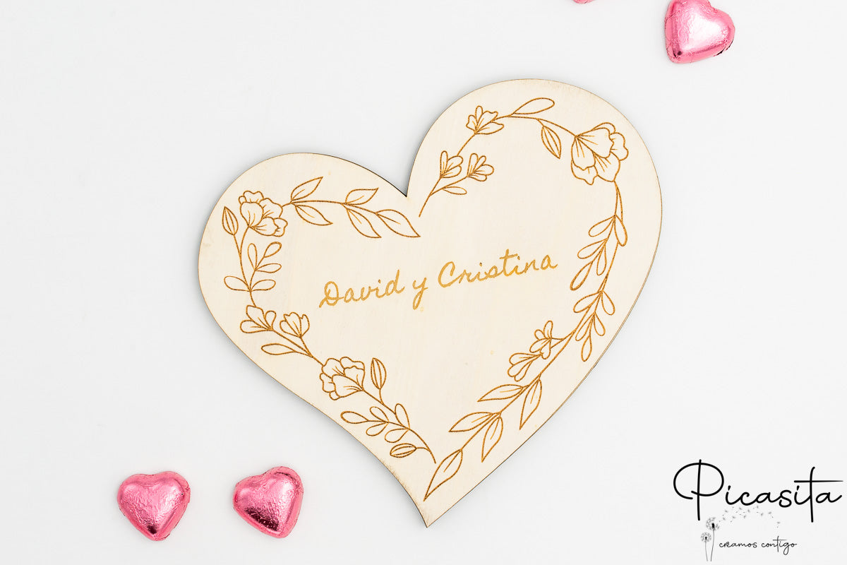 O que torna este produto único é a delicadeza do seu acabamento. Utilizamos tecnologia de laser de alta precisão para gravar os textos e o desenho floral da tampa. Por não usar tintas, o resultado é uma queimadura superficial na madeira em tom escuro, elegante e permanente, que não se apagará com o passar do tempo. É um presente para namorados pensado para durar e decorar o vosso canto favorito do lar.