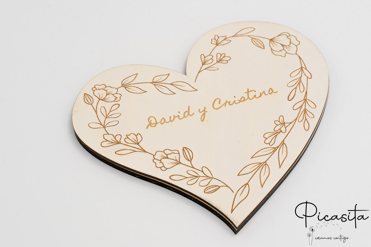 Além de ser um passatempo divertido para montar em casal, a caixa em forma de coração serve para guardar as peças ou como pequena caixa de joias sentimental. A tampa é também personalizada com os vossos nomes e esse desenho floral que traz aconchego. Sem dúvida, é um presente romântico que vai além do material, recordando todos os dias as bases da vossa união.