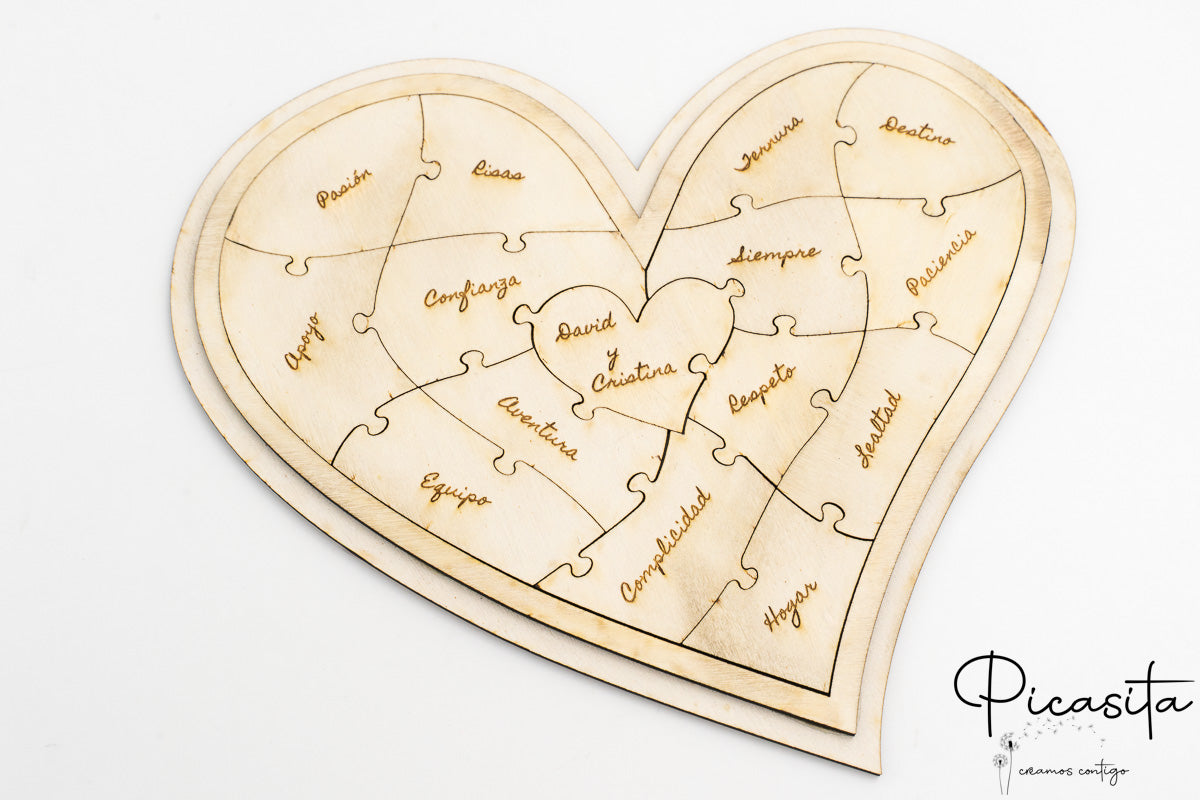 Este puzzle de enamorados é fabricado em madeira natural de alta qualidade e é composto por peças que encaixam na perfeição. Cada uma delas traz gravada uma das 14 palavras que definem os pilares de uma relação sólida: confiança, paixão, risos, apoio, aventura, entre outras. No centro, unindo tudo, encontra-se a peça mais importante personalizada com os vossos nomes, simbolizando que vocês são o núcleo de todo esse amor.