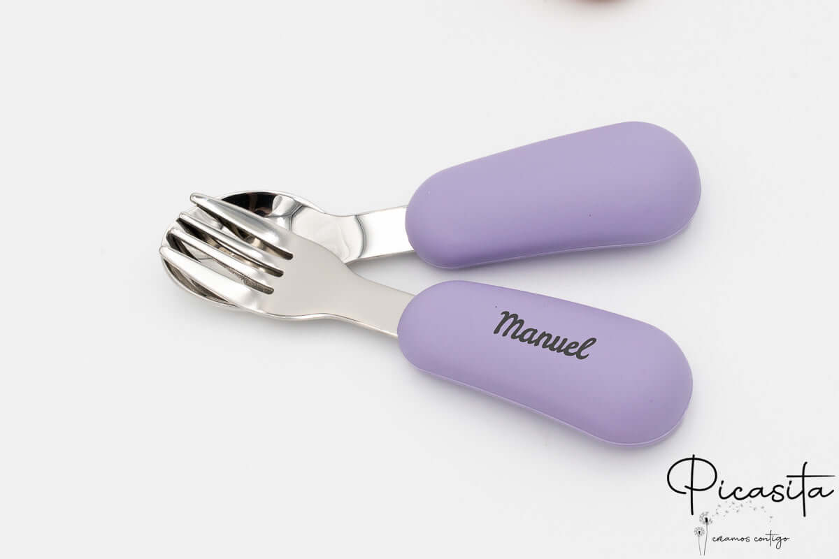 Na Picasita.es sabemos que os detalhes fazem a diferença. Por isso, oferecemos a possibilidade de criar um talher bebé personalizado único. Através da nossa técnica de gravação a laser de alta precisão, podemos incluir o nome do seu pequeno ou um simpático animalzinho nos cabos de silicone. O resultado é um acabamento monocromático em tom cinzento escuro/queimado que é elegante, permanente e totalmente seguro.