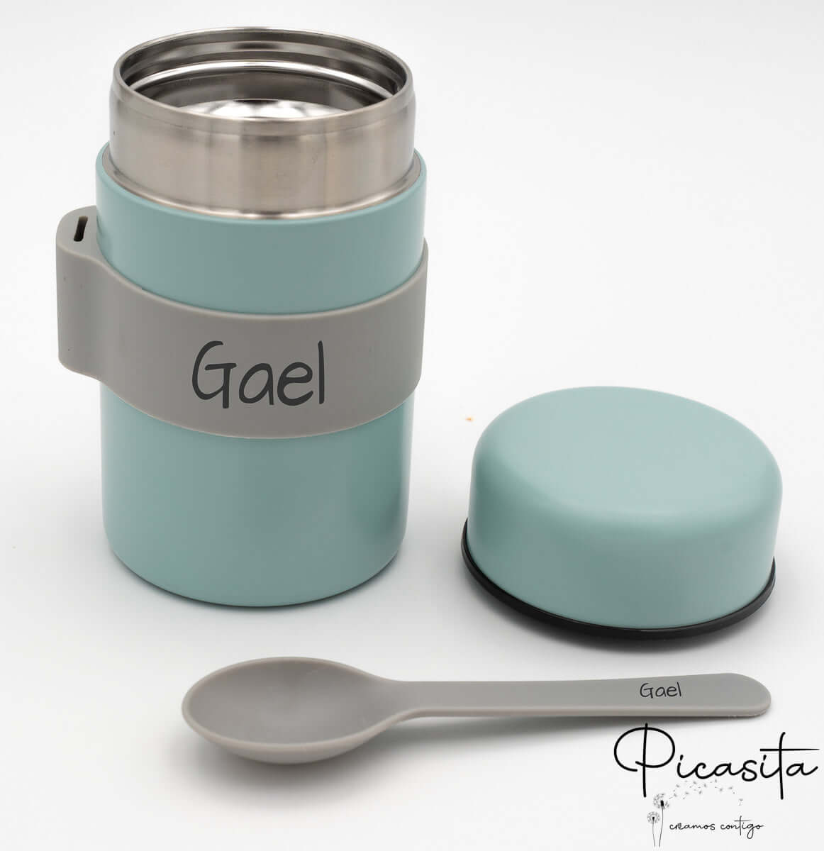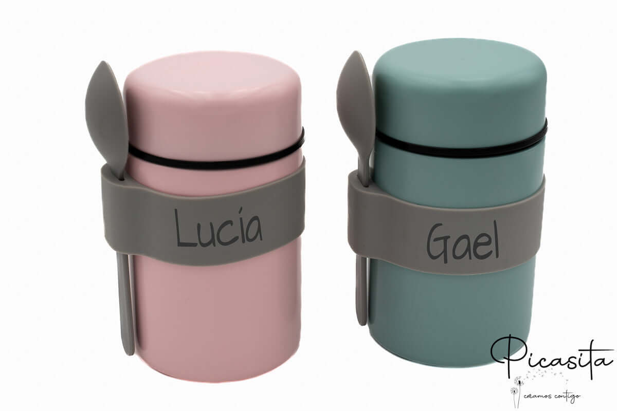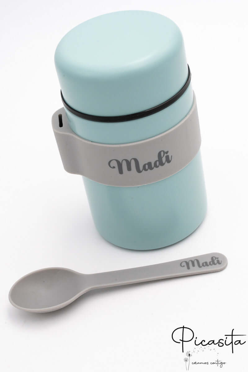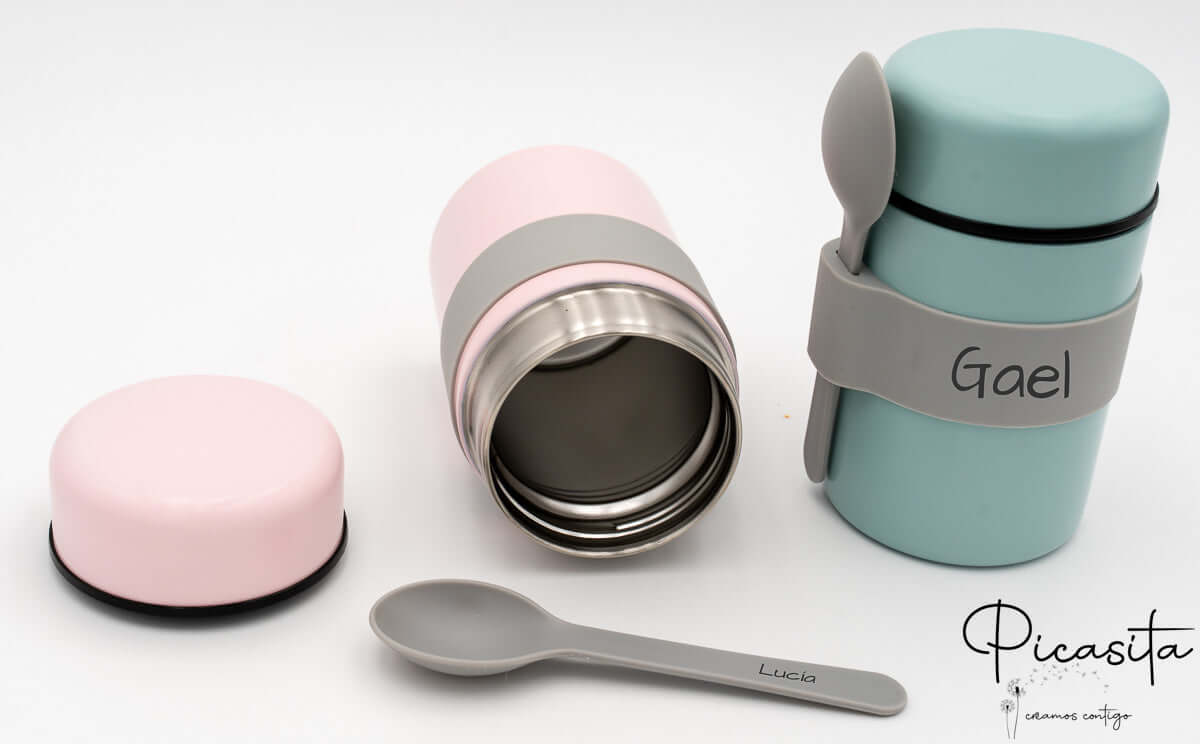 Fazemos com que este termo para comidas quentes seja inconfundível. Personalizamos tanto a banda de suporte como o cabo da colher gravando o nome por laser de alta precisão. Ao contrário dos autocolantes, esta técnica queima superficialmente o material deixando um acabamento elegante e monocromático (cinzento escuro/preto) que nunca se apaga, mesmo com uso intensivo. Para completar o equipamento do teu bebé, convidamos-te a descobrir a nossa gama de Louça Infantil Personalizada e combinar cores a condizer.