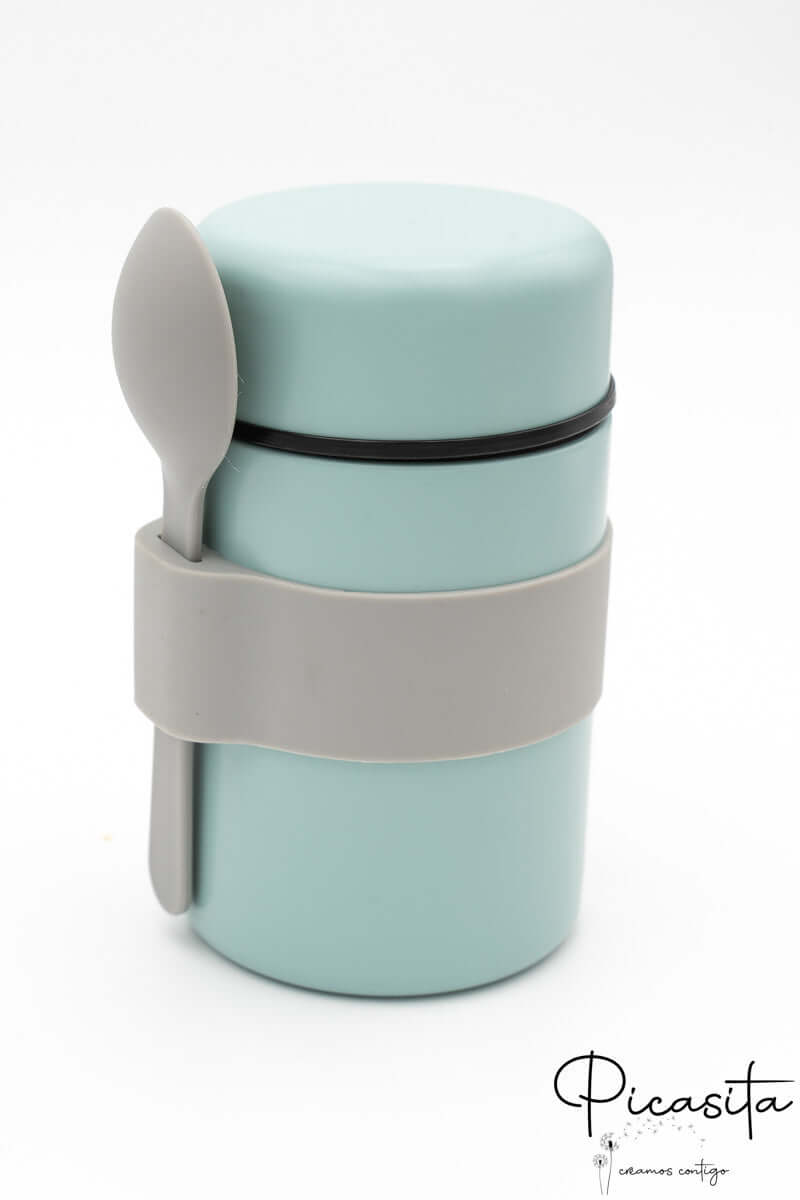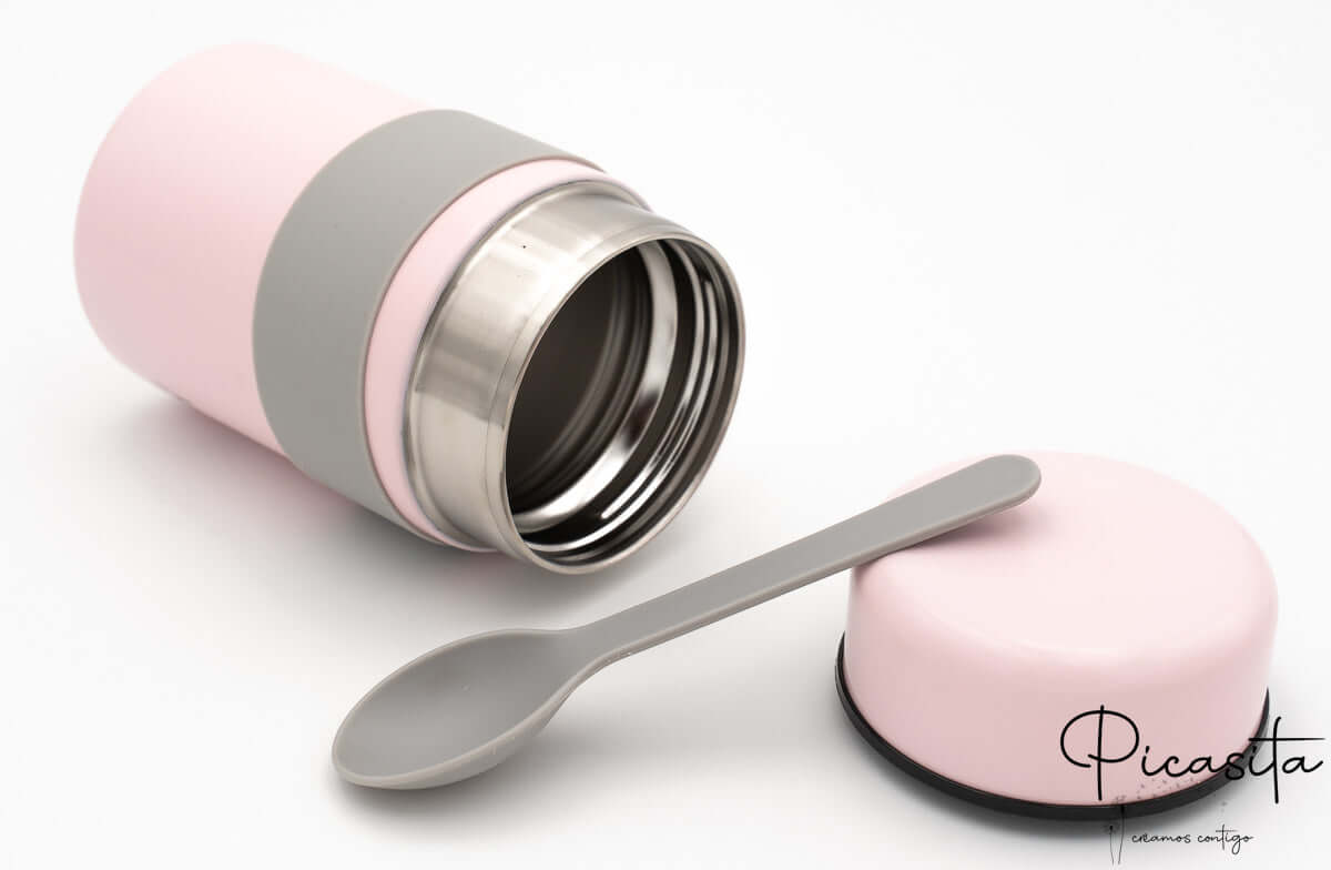 Desenhámos este produto a pensar na logística familiar real. Funciona na perfeição como termo para puré, sopas ou alimentos sólidos. O que o torna único é a sua banda de silicone exterior, que atua como um prático cinto para segurar a colher de silicone (incluída). Este detalhe torna o nosso modelo num termo para bebés extremamente funcional, garantindo que tenhas sempre os talheres à mão e limpos, evitando que se percam no fundo da mala.