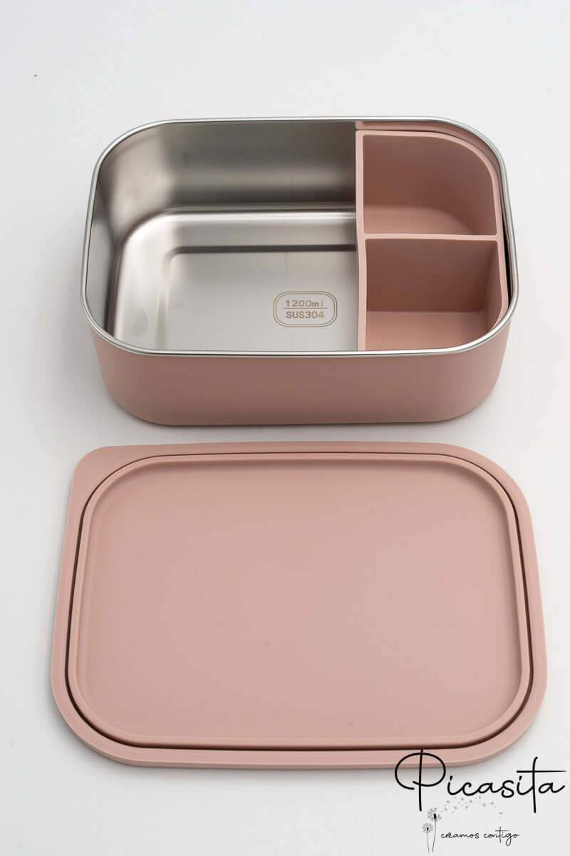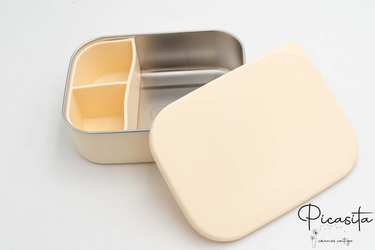 A estrutura deste recipiente é fascinante e extremamente prática. Conta com uma robusta bandeja interior que funciona como uma marmita de aço de alta qualidade, garantindo a pureza, a higiene e o sabor original dos teus alimentos sem transferir microplásticos. Esta bandeja metálica está revestida por uma camada exterior e uma tampa hermética de silicone de toque suave em belíssimas cores mate (Azul, Creme, Rosa Claro e Verde Claro). Além disso, destaca-se por incluir um engenhoso inserto com dois compartimentos de silicone removíveis. Diz adeus para sempre às refeições misturadas e desfruta dos teus pratos exatamente como os preparaste!