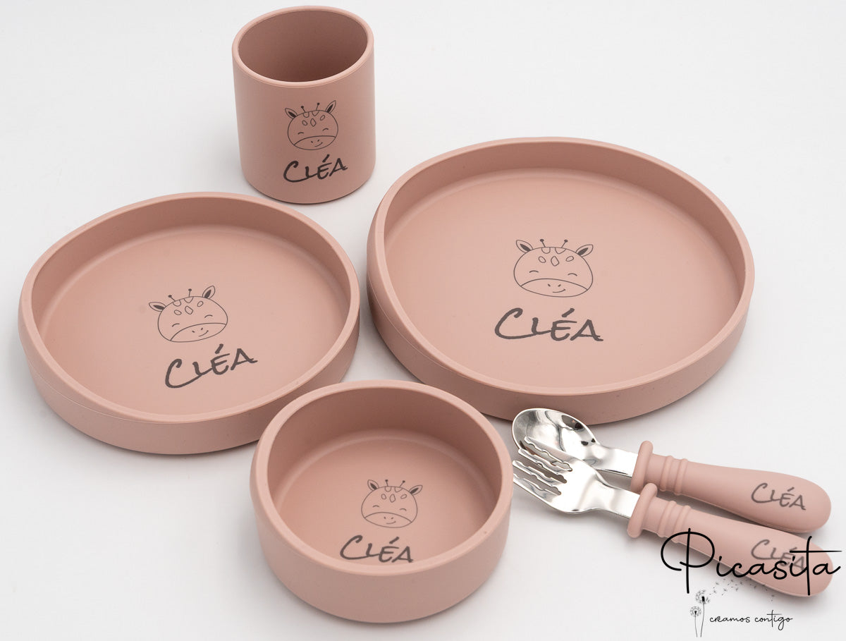 A única diferença é que este conjunto de 6 peças não inclui a babete de silicone. Foi desenhado assim para pais que preferem continuar a usar babetes de tecido mas querem o resto dos complementos personalizados.